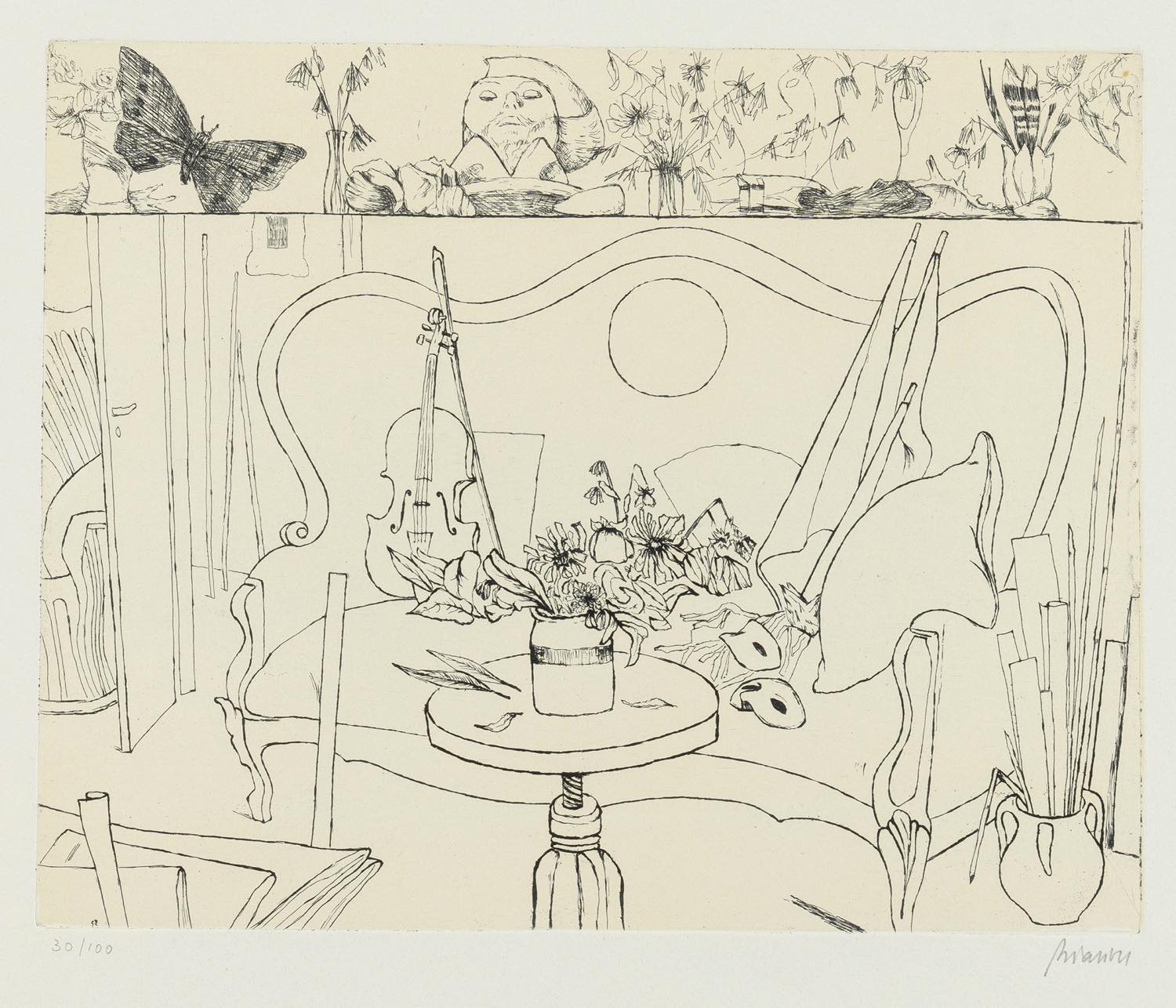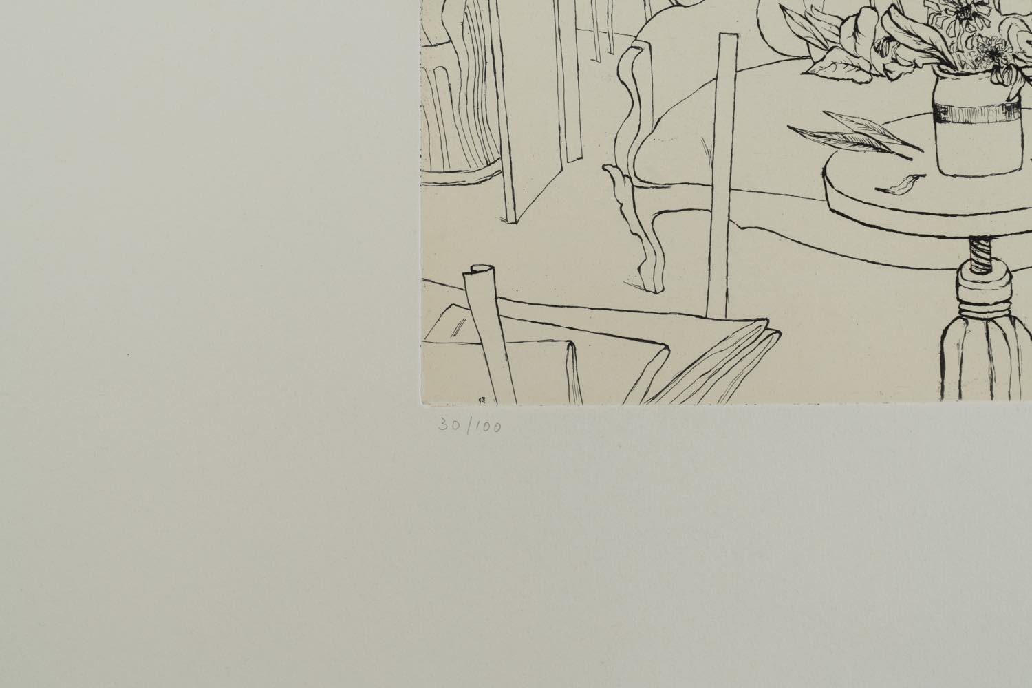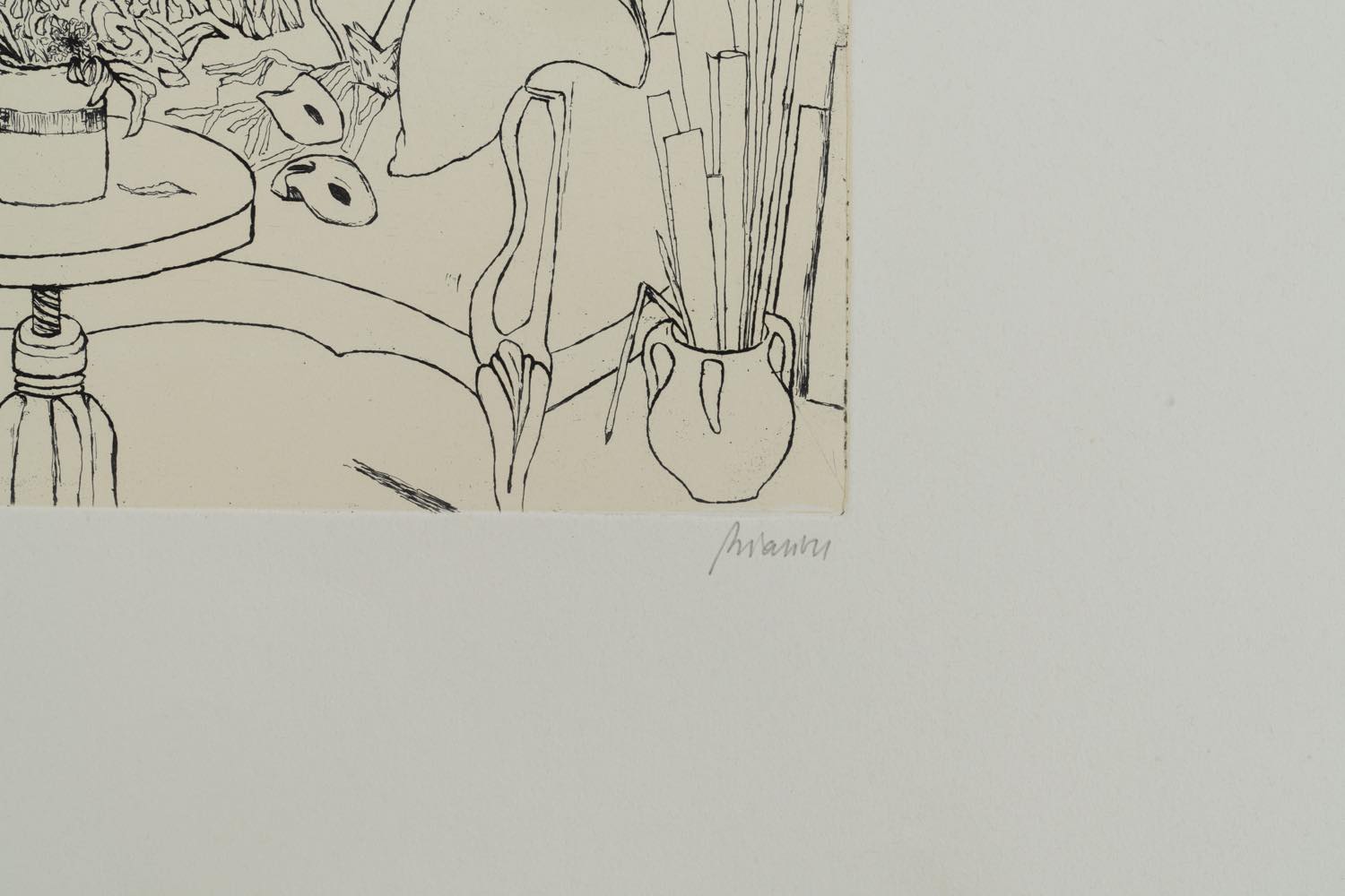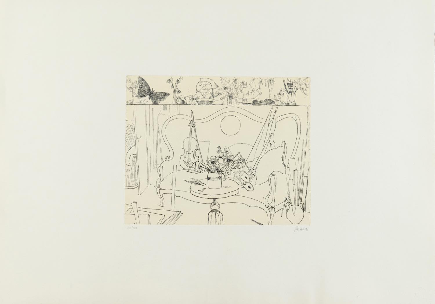 Renzo Biasion (Treviso 1914 - Firenze 1996), “Interno”. Acquaforte a colori su carta, firmata in basso a destra, numero di tiratura in basso a sinistra 30/100, Lastra H cm 24x29.5 Provenienza: Galleria Forni - Bologna