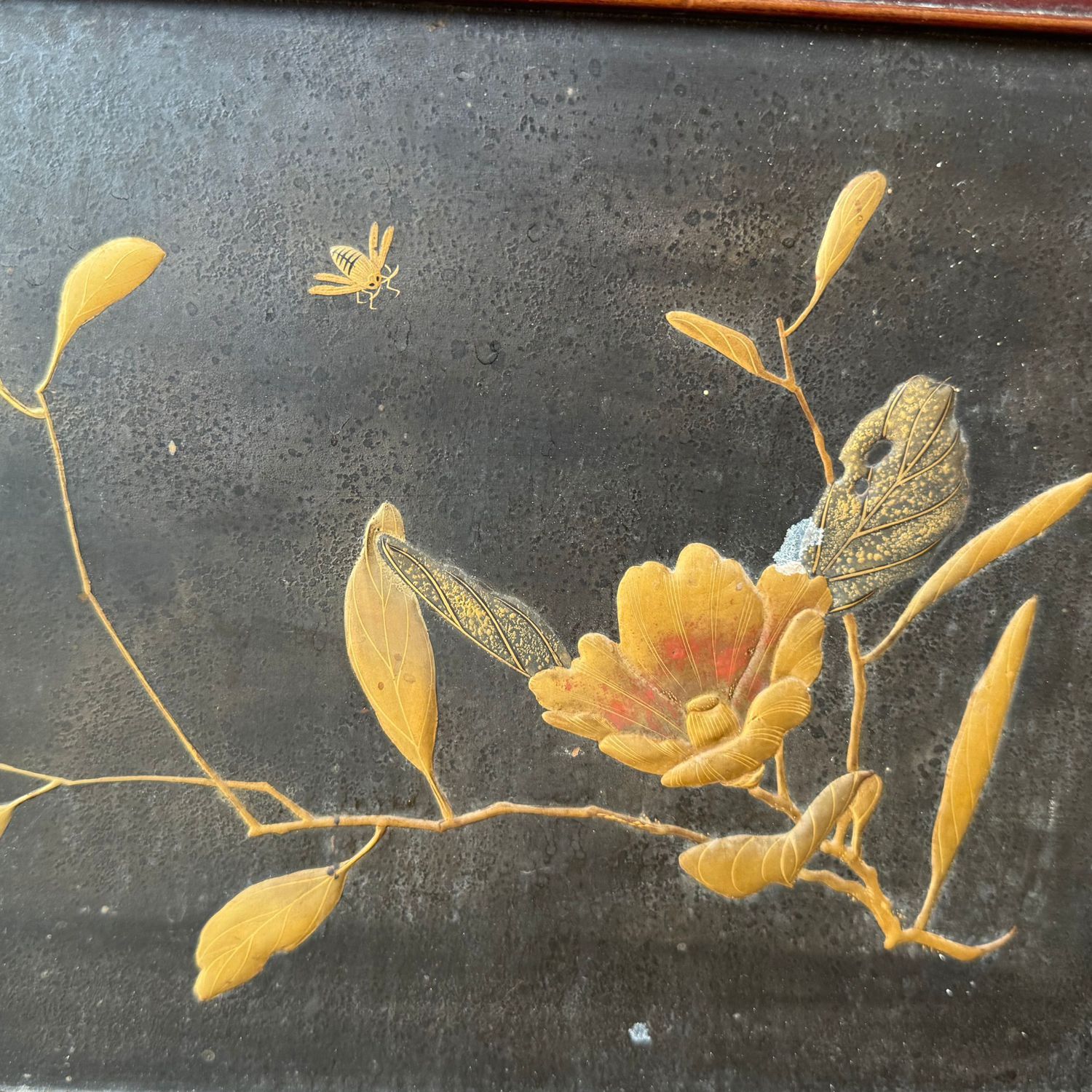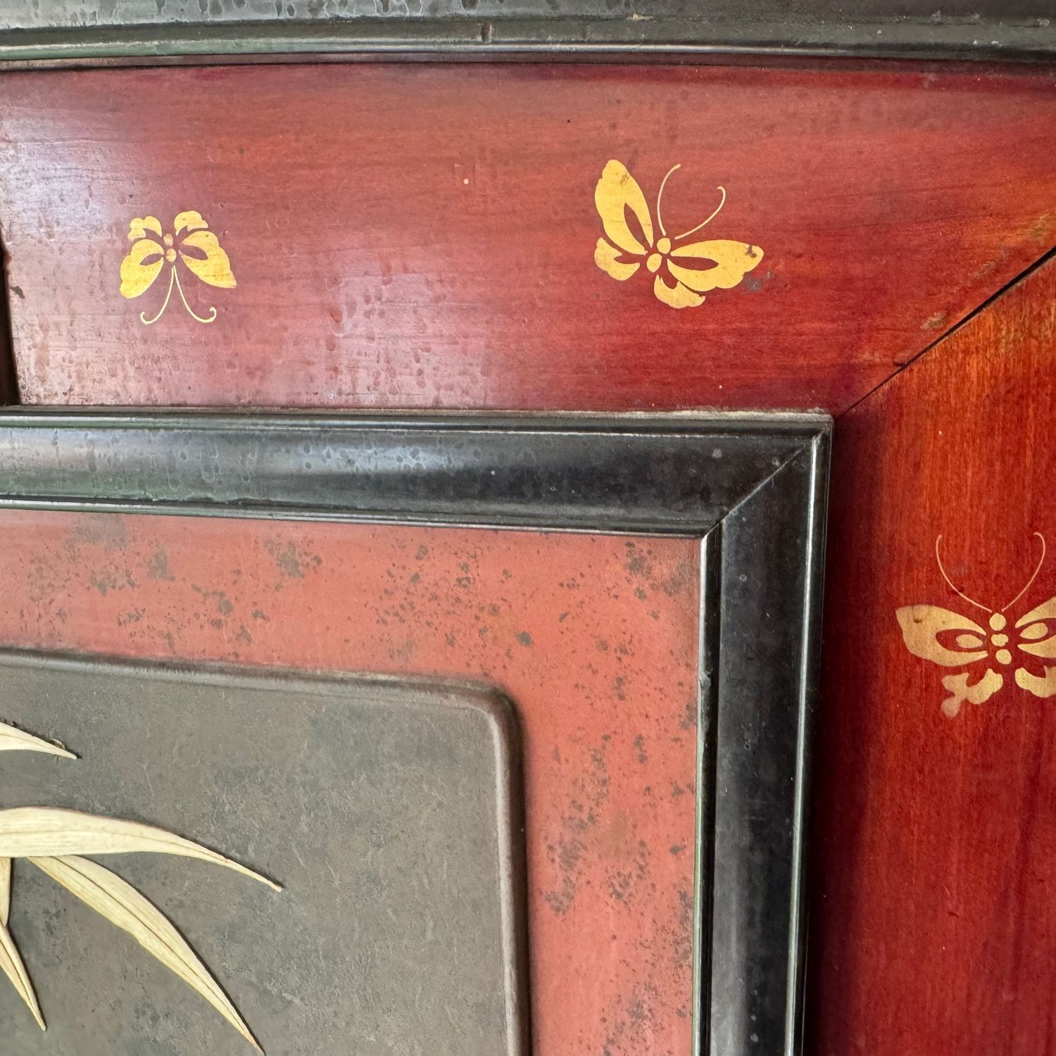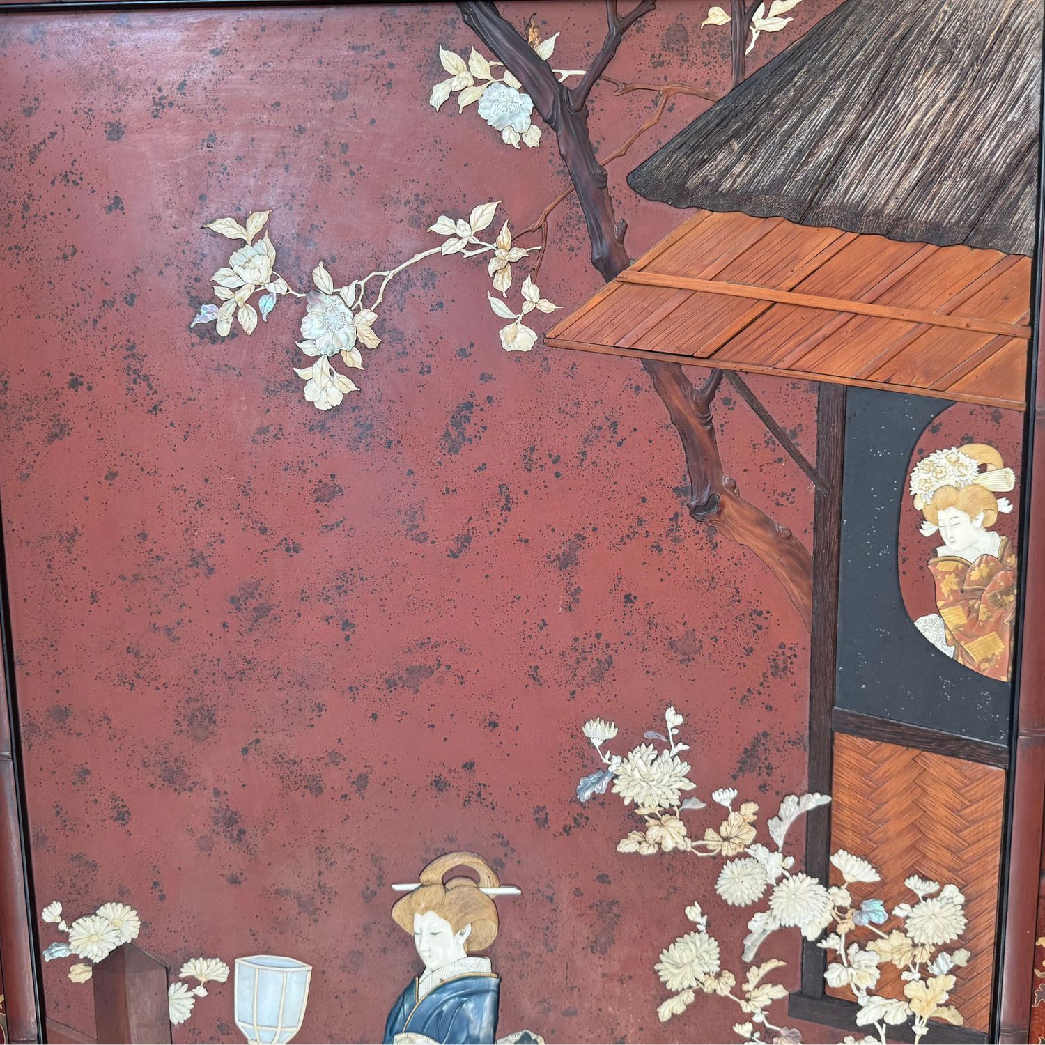 Separè a due battenti in legno laccato e decorato con figure di area Orientale e materiali nobili misti. Periodo inizio XX secolo.