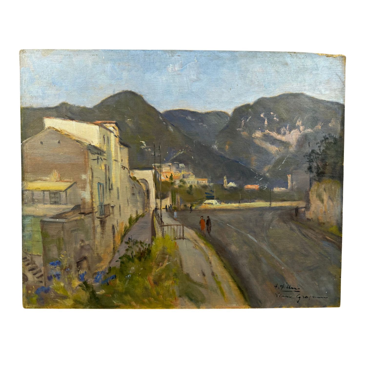 Dipinto olio su pannello, periodo XX secolo scuola Italiana, raffigurante Paesaggio a Gragnano.
