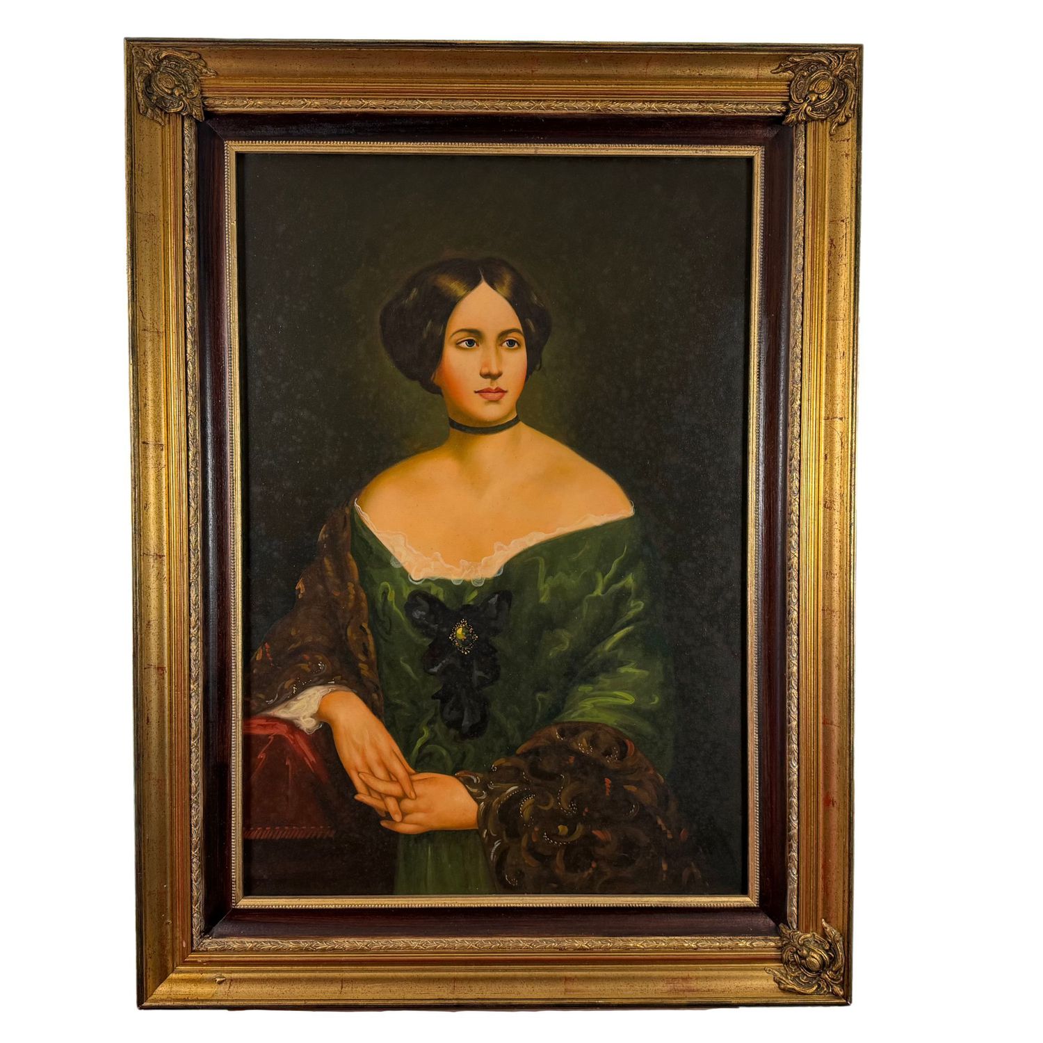 Dipinto olio su tela, periodo seconda metà XX secolo scuola Italiana, raffigurante Ritratto di donna in abito elegante.