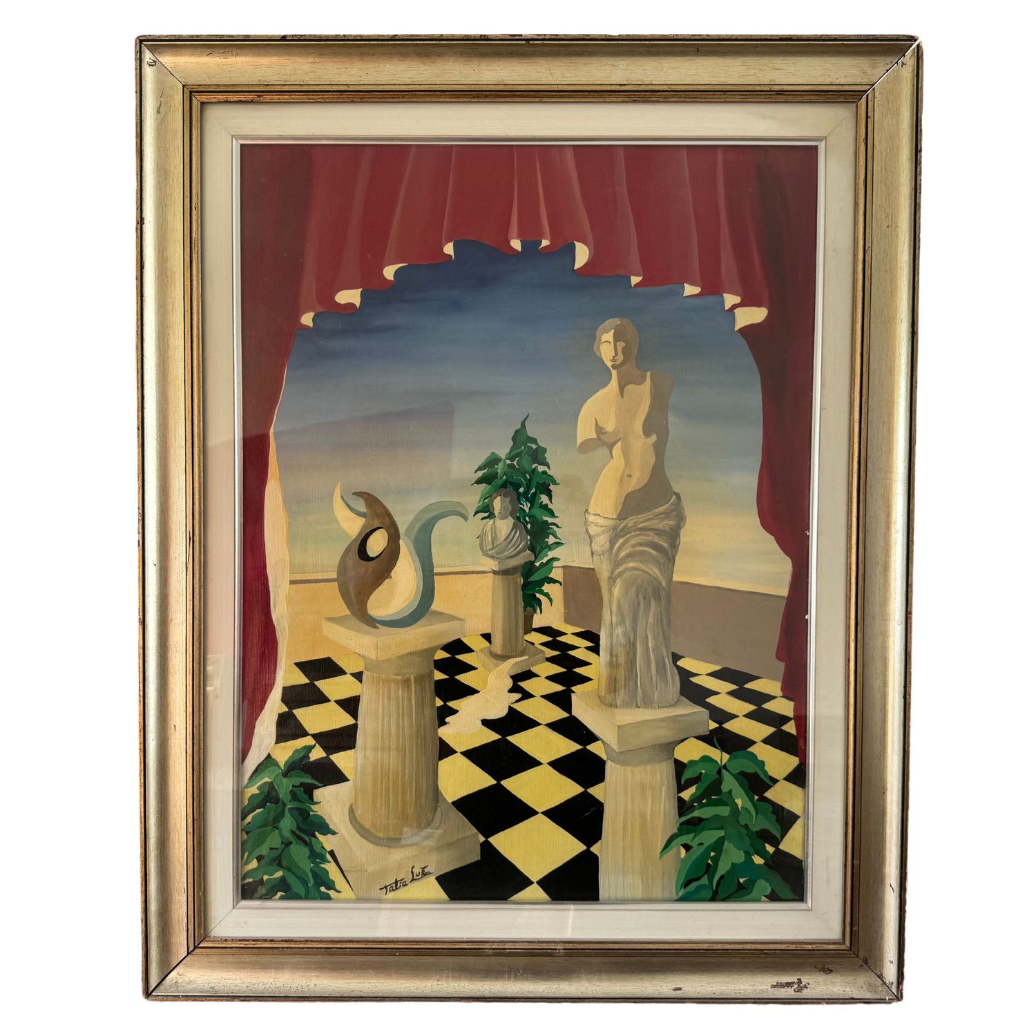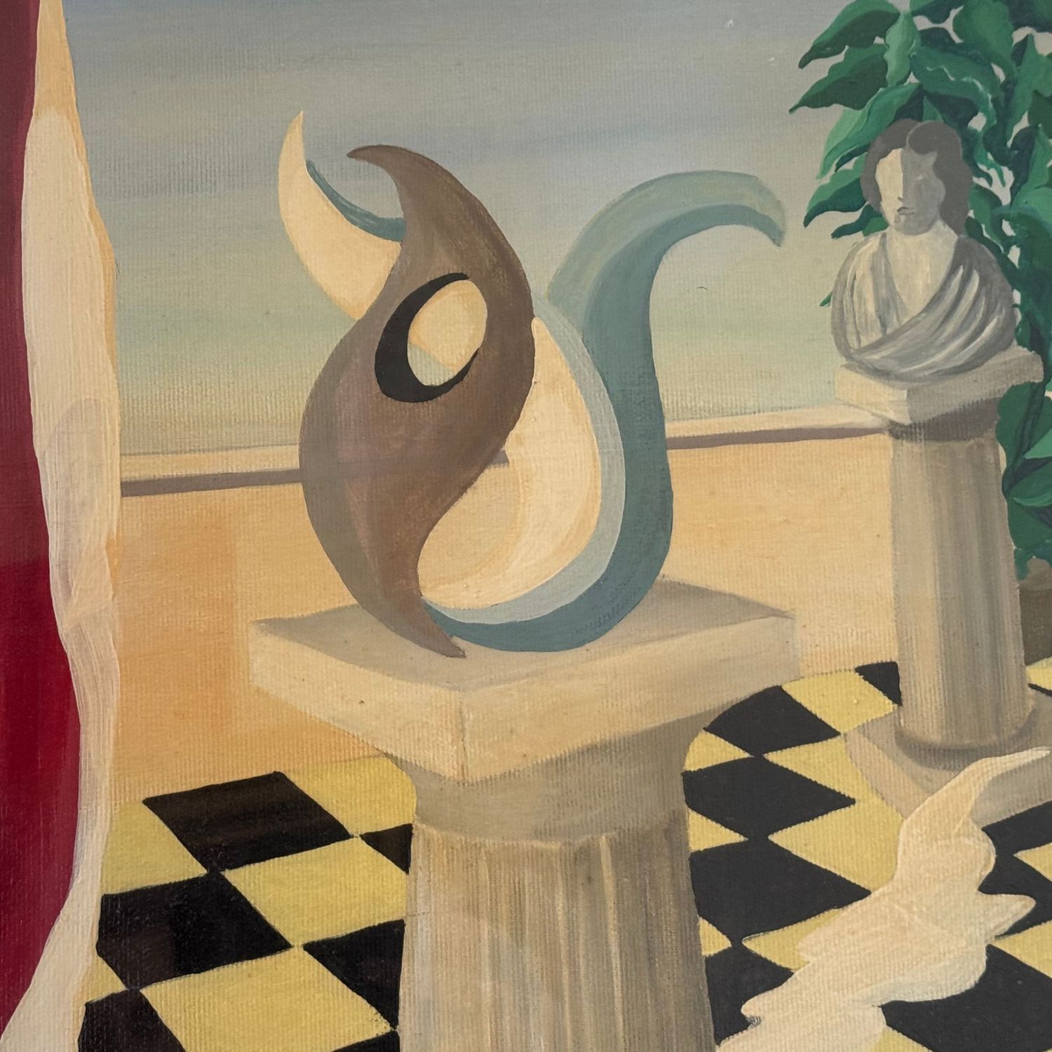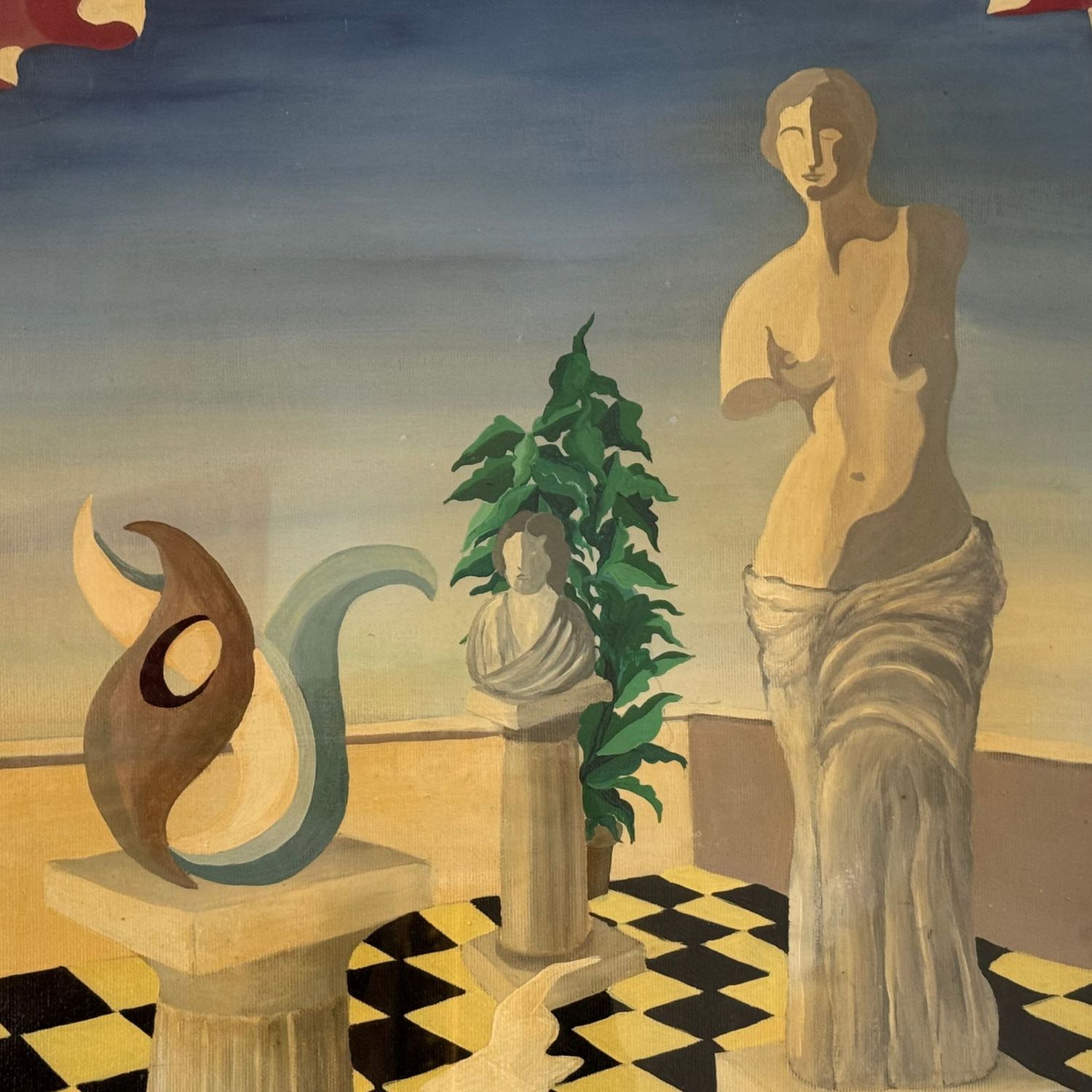 Dipinto olio su tela da artista contemporaneo, raffigurante Sculture in terrazza.