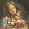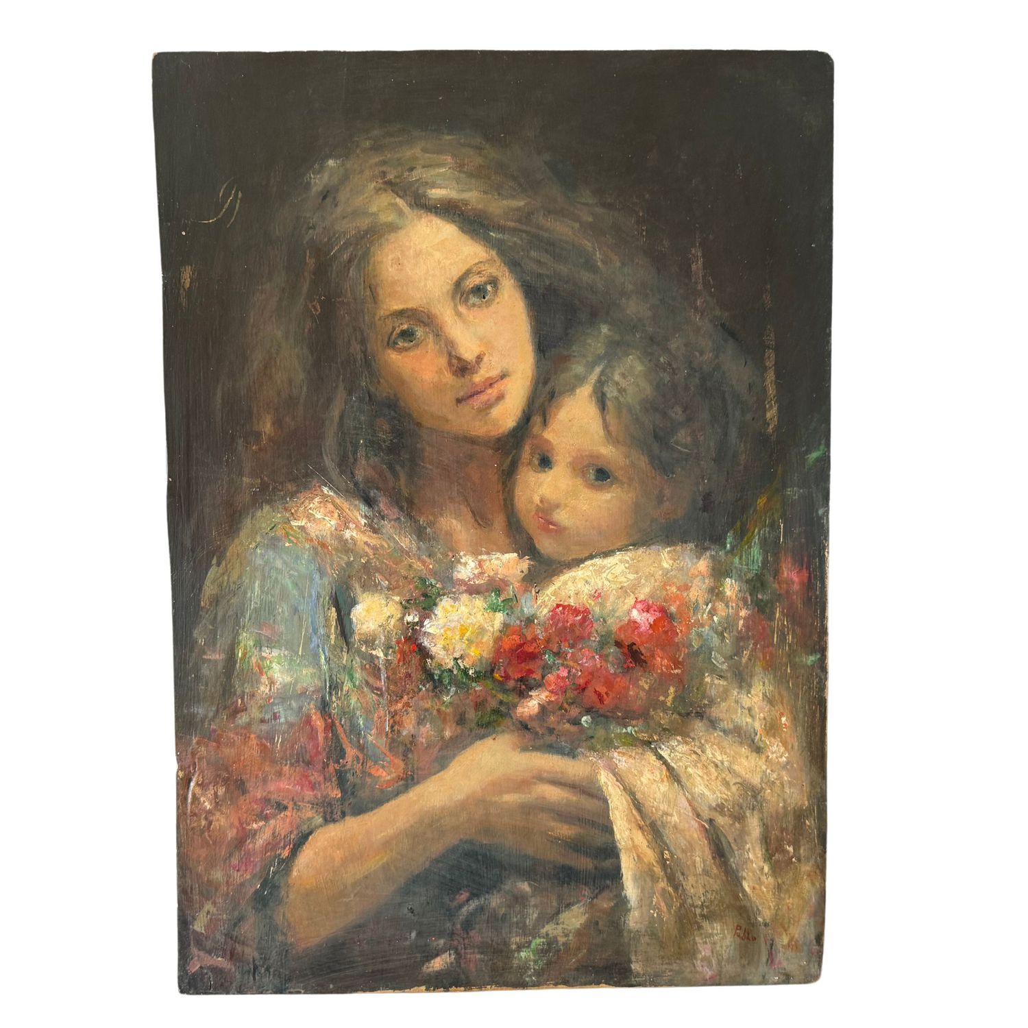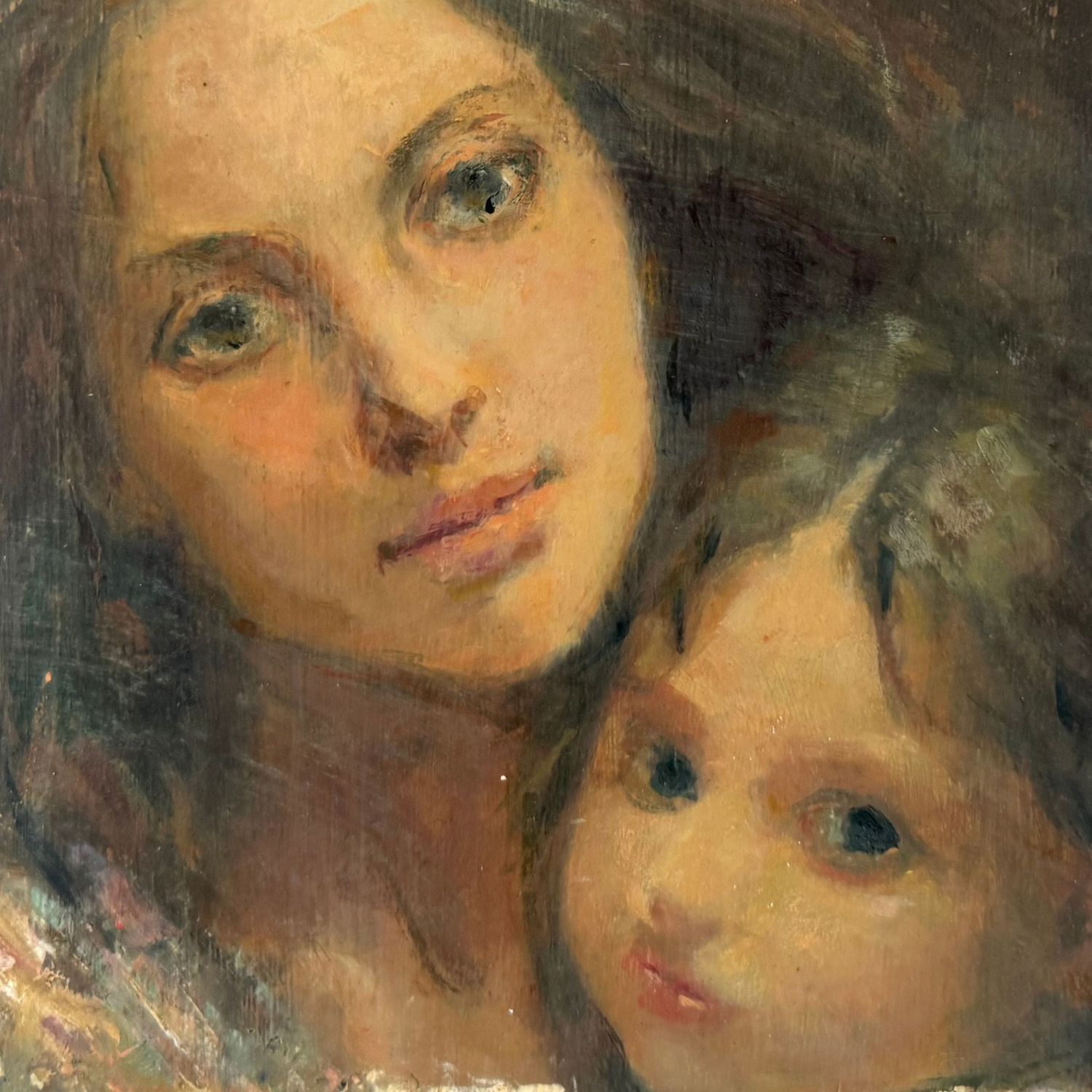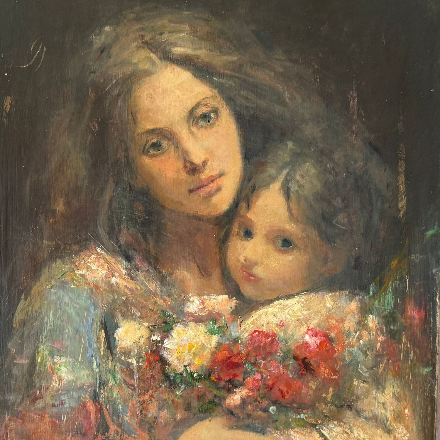 Dipinto olio su pannello, periodo XX secolo scuola spagnola , raffigurante Dolce ritratto materno.