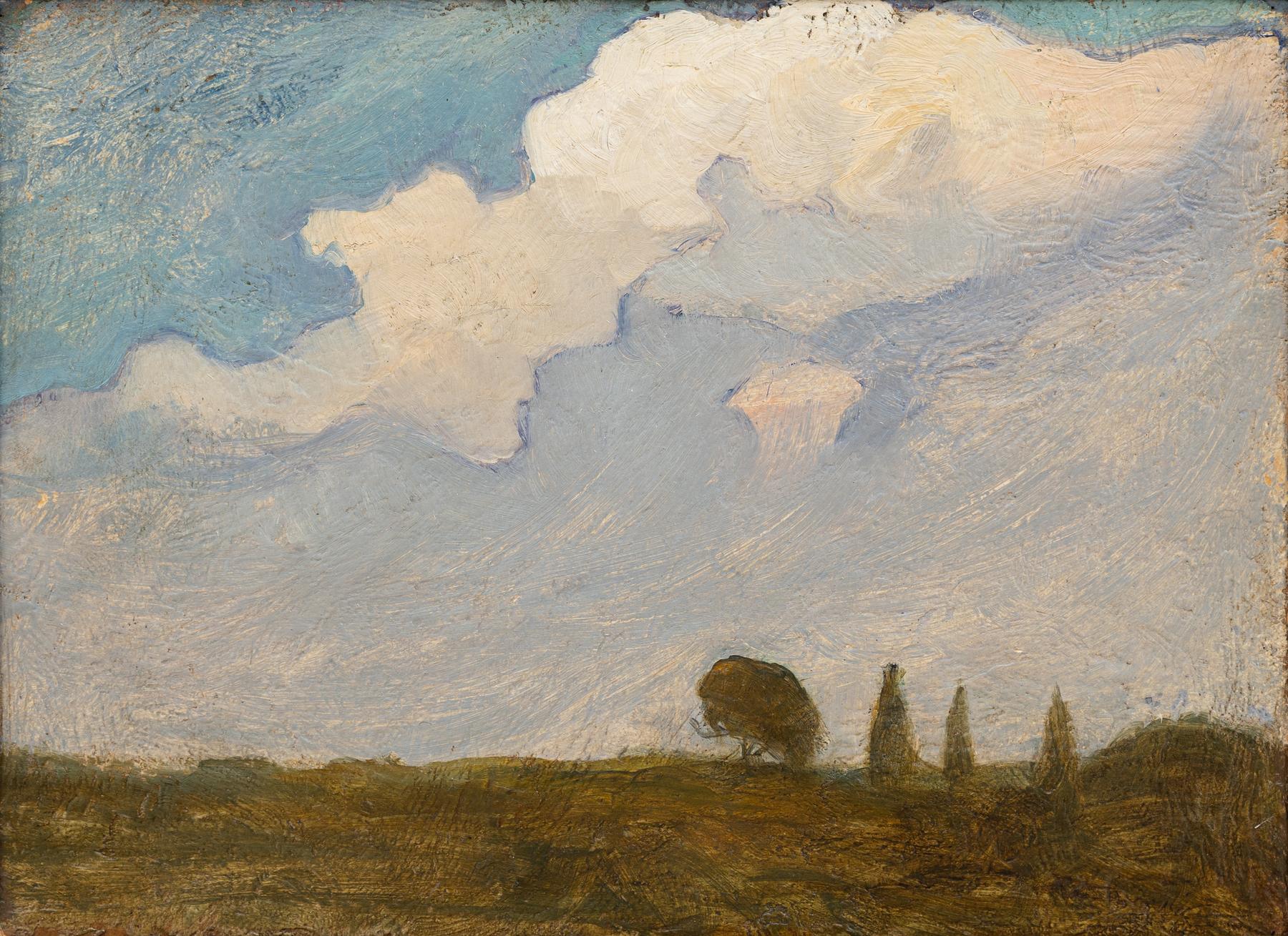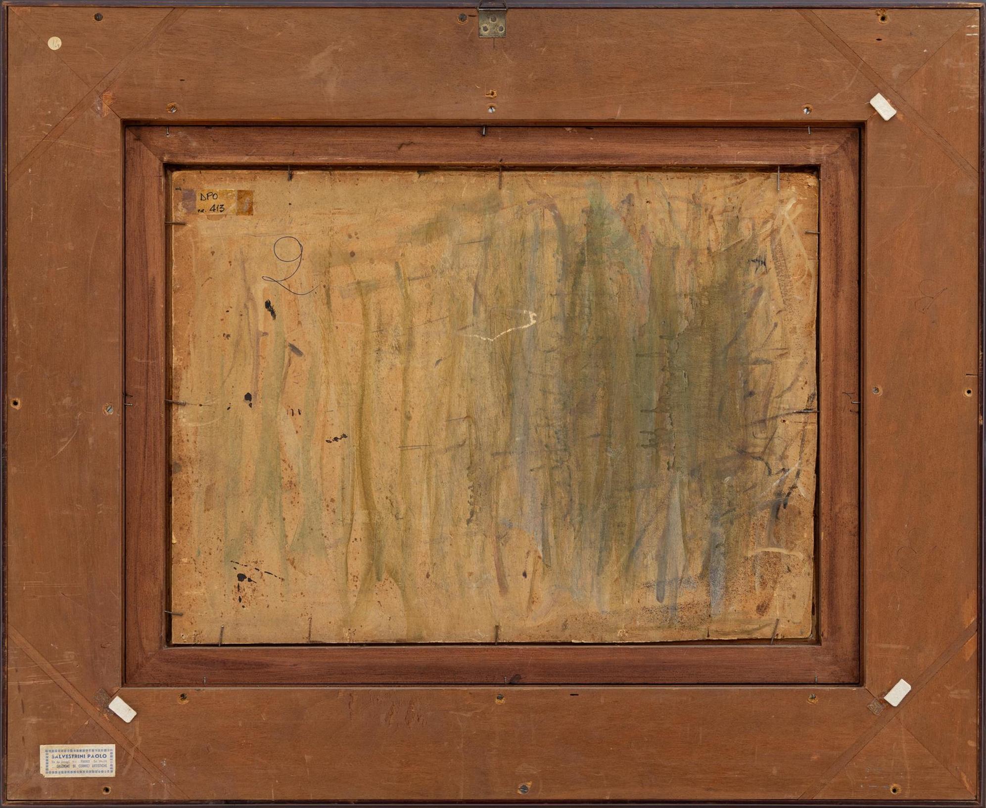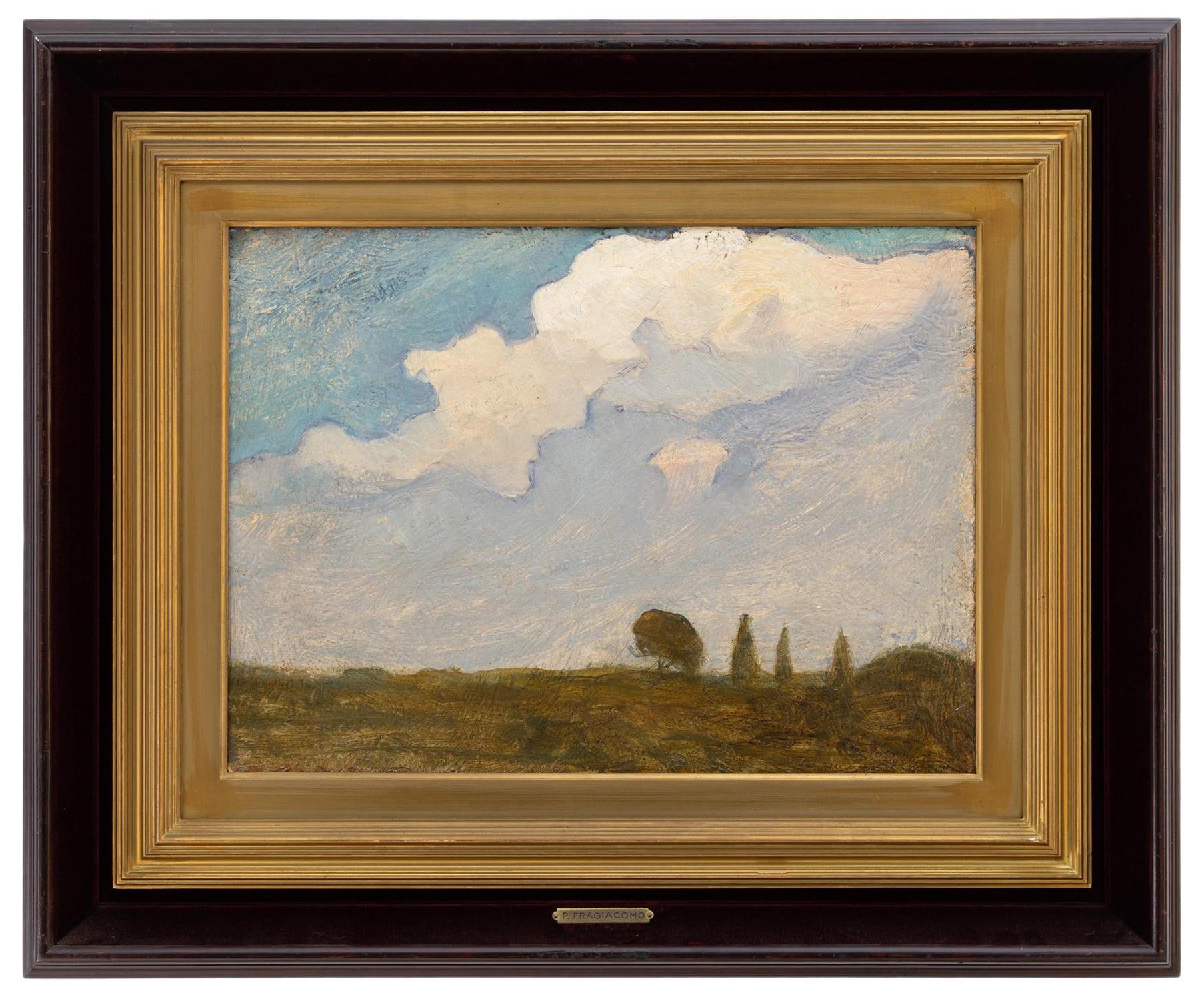 Pietro Fragiacomo - Paesaggio - Trieste 1856 - Venezia 1922 - Olio su cartone cm 35x48 - Pietro Fragiacomo, nato a Trieste nel 1856, si trasferì a Venezia da giovane e iniziò a lavorare presso la Società Veneta di Costruzioni Meccaniche. Dopo aver abbandonato gli studi all'Accademia di Belle Arti, continuò a dipingere sotto l'influenza di artisti come Giacomo Favretto ed Ettore Tito. Nel 1880, espose alla mostra nazionale di Torino e successivamente partecipò a varie esposizioni nazionali e internazionali.La sua pittura si concentrò sul paesaggio dell'entroterra lagunare veneziano, privilegiando vedute meno convenzionali e popolari rispetto ai suoi contemporanei. Nei suoi dipinti, la veduta diventava un mezzo per esprimere il suo stato d'animo, come evidenziato nei titoli come "Pace" e "Riposo". Nel 1893, ottenne riconoscimento con "La campana della sera", un dipinto che rappresenta un suggestivo scorcio veneziano al tramonto.Negli anni Novanta, Fragiacomo cambiò il suo stile, adottando una pittura più materica e sperimentando l'uso della tempera con sovrapposizioni di velature a olio. Nel 1895, entrò nel comitato organizzatore della Biennale di Venezia, esponendo regolarmente alla manifestazione. Nel corso del Novecento, esplorò influenze dell'Art Nouveau e partecipò a esposizioni nazionali e internazionali.La sua vasta produzione, stimata in circa 500 opere, è oggi dispersa tra collezioni private e pubbliche. Pietro Fragiacomo morì a Venezia nel 1922. Anche sua sorella, Antonietta, fu una pittrice di paesaggi, partecipando attivamente alla Biennale di Venezia e continuando la sua carriera fino a data di morte sconosciuta.