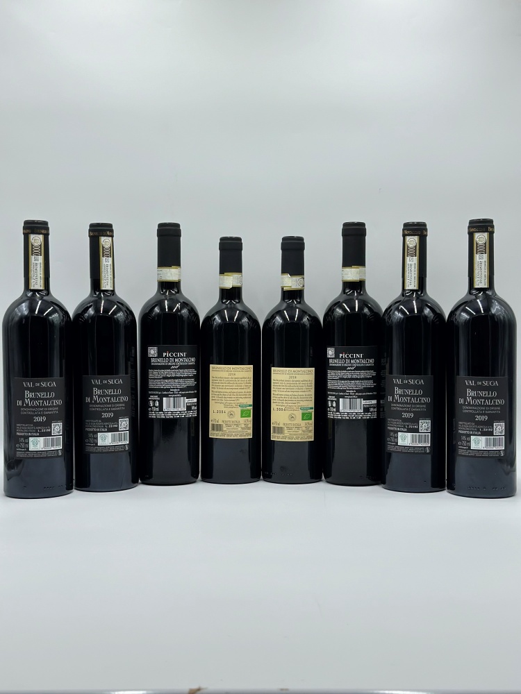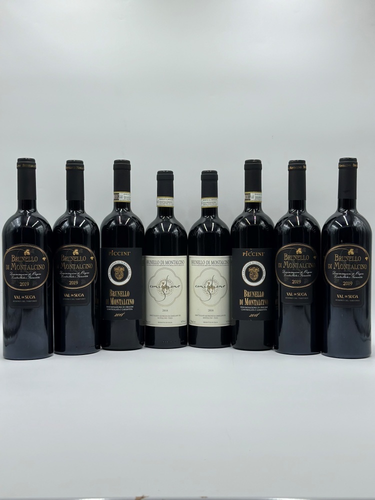 Selezione Brunello di Montalcino DOCG - 8 bottiglie (bt), annate 2018 e 2019. Livello : entro il collo (WN). Condition report : etichetta e capsula in perfette condizioni.