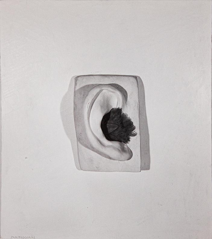Claudio Parmiggiani, Olio su tavola, gesso e piume, 42x36,5x9,5cm, Orecchio; Autentica dell'artista su foto