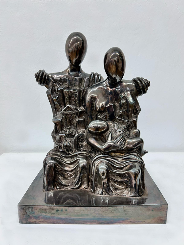 Giorgio de Chirico, Scultura in bronzo (argentato), H. 36,5 cm, Archeologi con bambino, Tratto da un gesso originale inedito del 1969, Es. N. 0/0 ; Certificato di autenticità della Fondazione Giorgio e Isa de Chirico Prof. Paolo Picozza; Questa opera fa parte dell'edizione di 9 esemplari di cui 7 numerati da I/VII° più due prove d'artista E/A I/II E/A II/II e una prova 0/0 destinata alla Fondazione Giorgio e Isa de Chirico