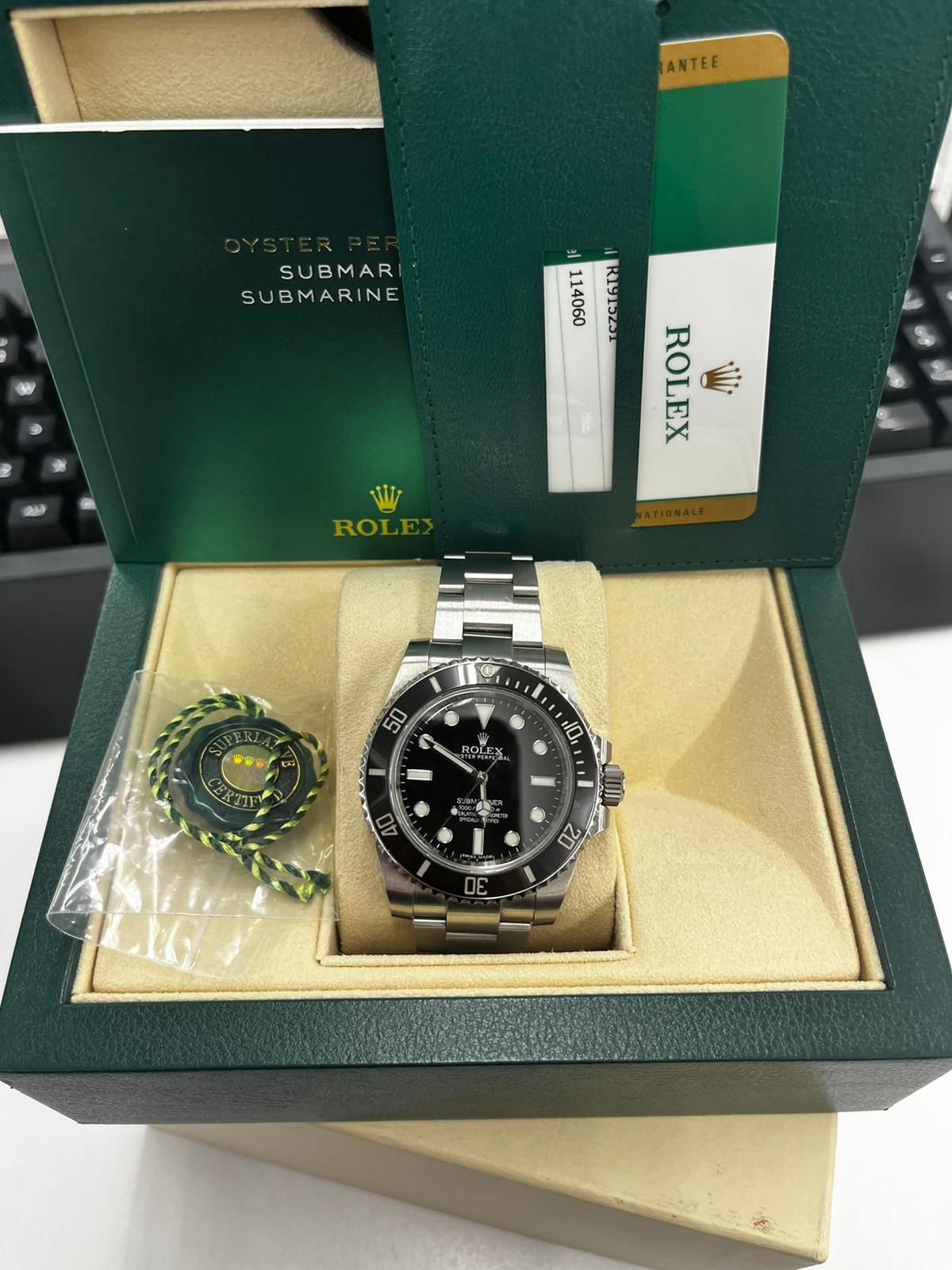 Marca Rolex Modello Submariner (No Date) Numero di referenza 114060 Carica Automatico Materiale della cassa Acciaio Materiale cinturino Acciaio Corredo Con scatola di fornitura e documenti originali Calibro Carica Automatico Cassa Materiale della cassa Acciaio Diametro 40 mm Materiale lunetta Ceramica Vetro Vetro zaffiro Quadrante Nero Numeri sul quadrante Senza numeri Cinturino Materiale cinturino Acciaio Colore cinturino Acciaio Chiusura Déployante Materiale chiusura Acciaio