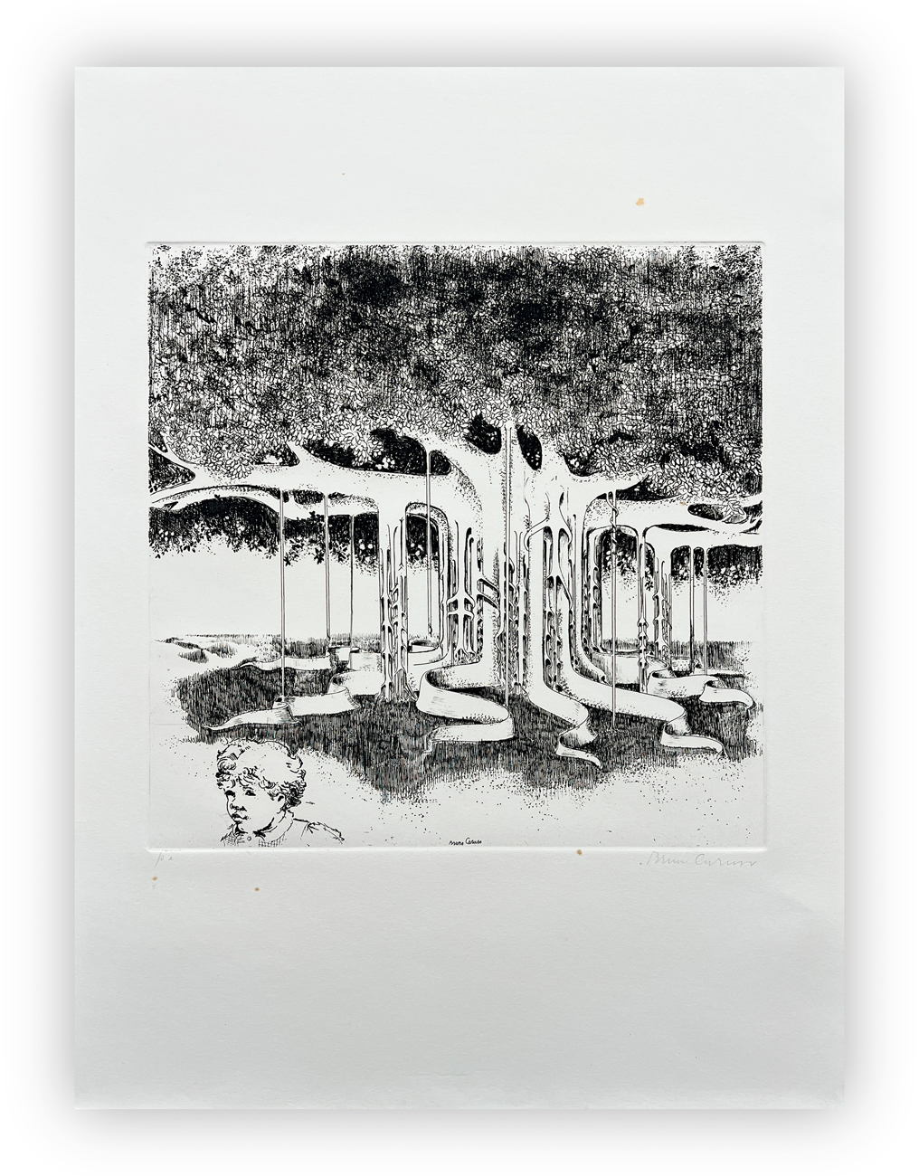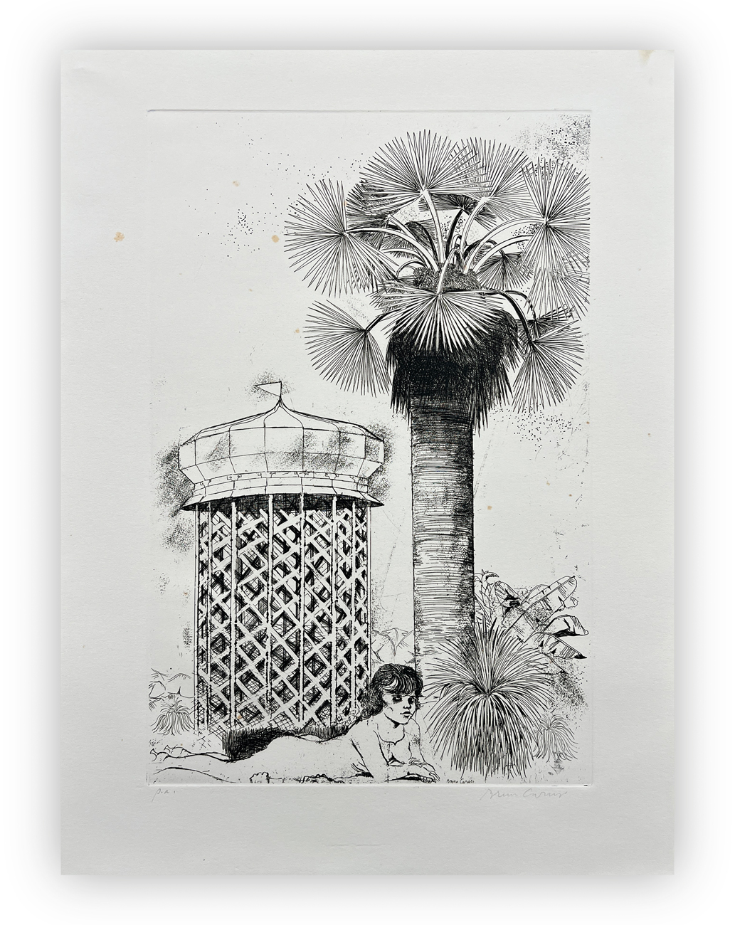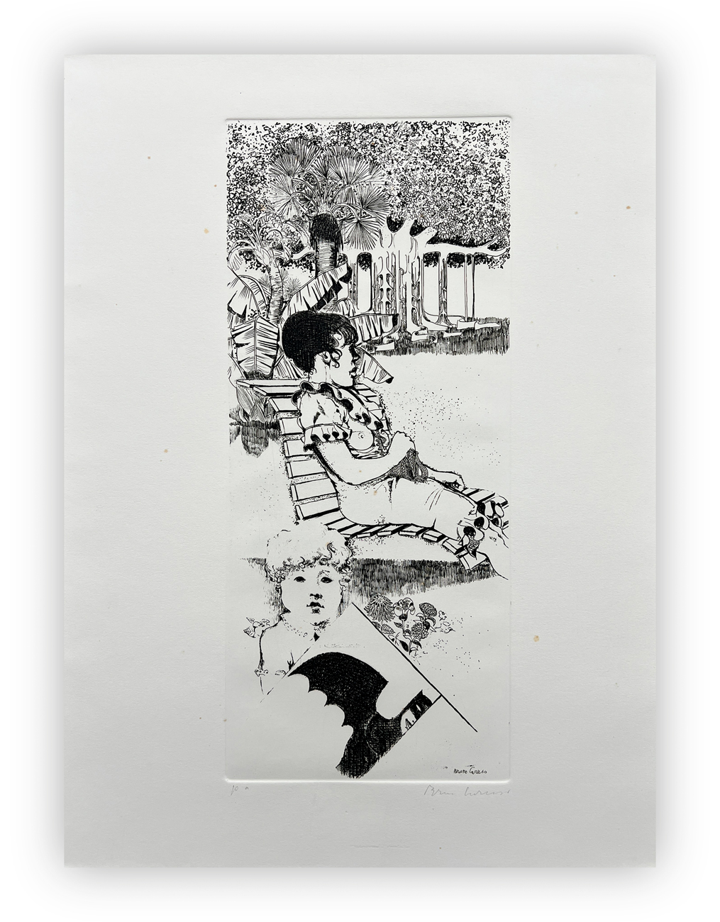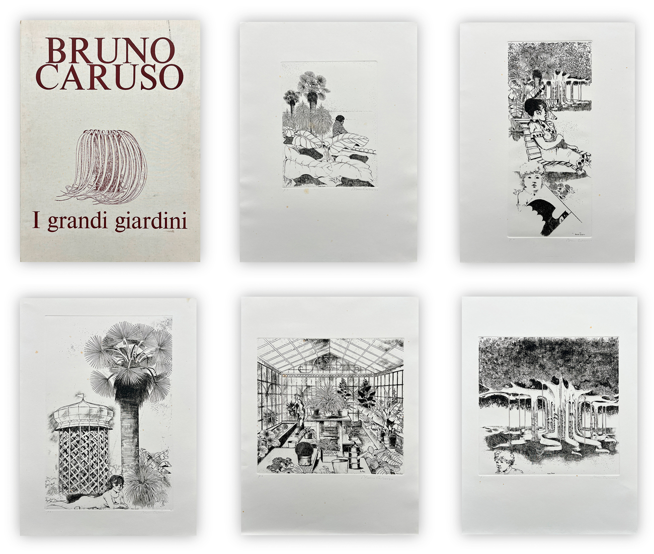 Cartella contenente testo di Leonardo Sciascia illustrato da 5 acqueforti su carta Fabriano di Bruno Caruso, ciascuna recante firma e numerazione (Esemplari P.A.) a matita al fronte
