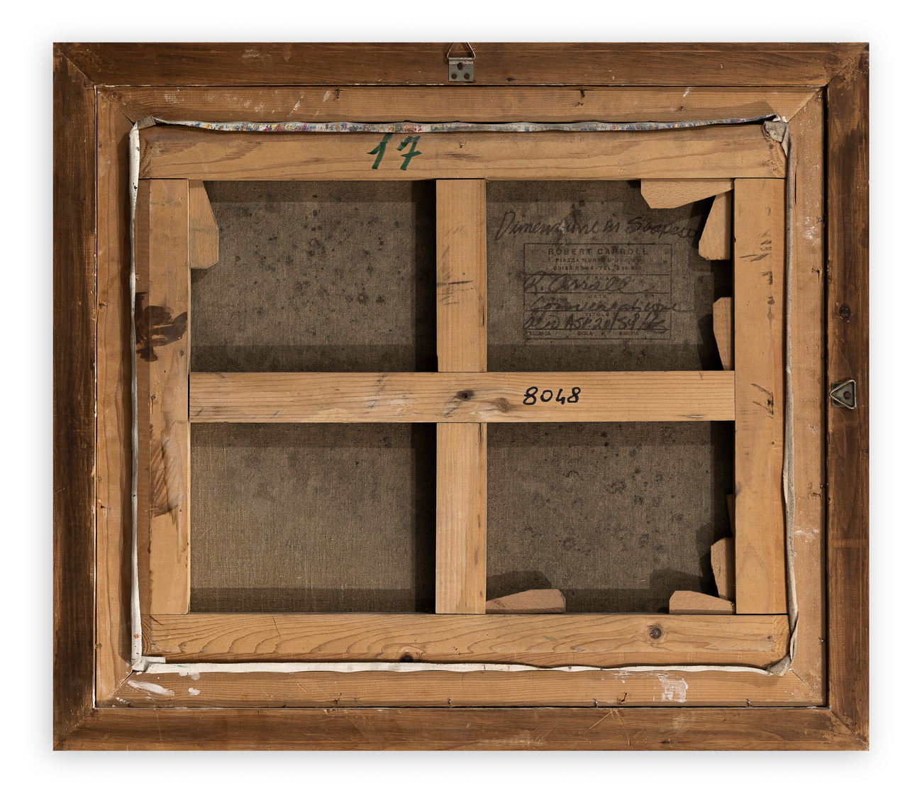 Timbro dell'Artista con firma, titolo, tecnica, misure e numero di repertorio al retro