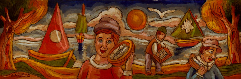 ROBERTO SGUANCI Ritorno dalla pesca Olio su cartone cm. 12x40 Firma in basso...