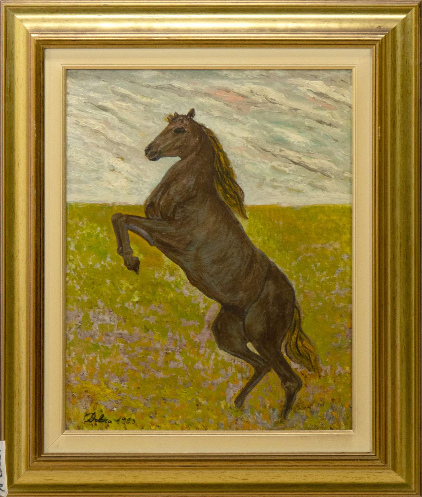 Lotto 112 | Mario Dolara, Cavallo impennato, 1983, olio su tavola, cm 50x40