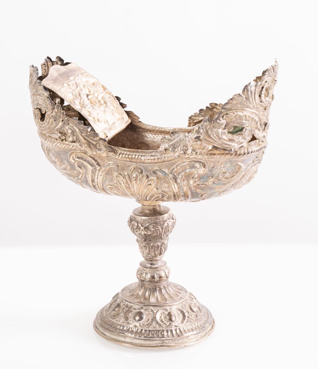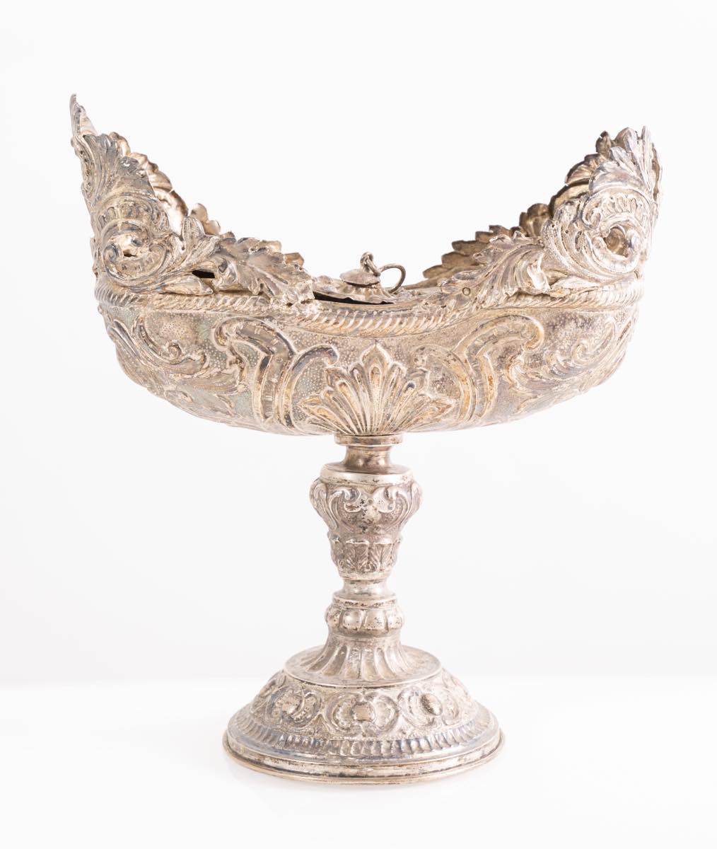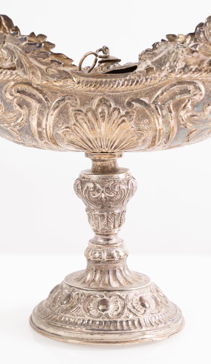 Navetta porta incenso in argento, fine del XVII secolo/inizio del XVIII secolo cm 21,5x19x9,5, peso gr 385 sul bordo inferiore reca punzoni