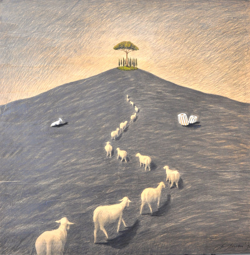 LORENZO LAZZERI Viaggio misterioso, 1998 Grafite e olio su tavola cm. 80x80...