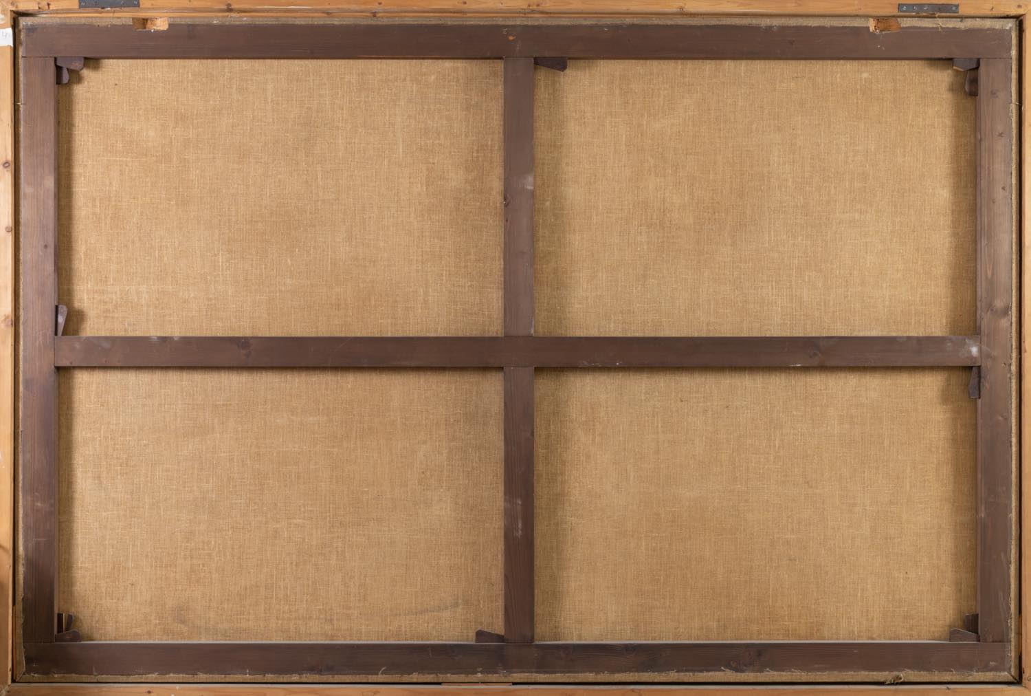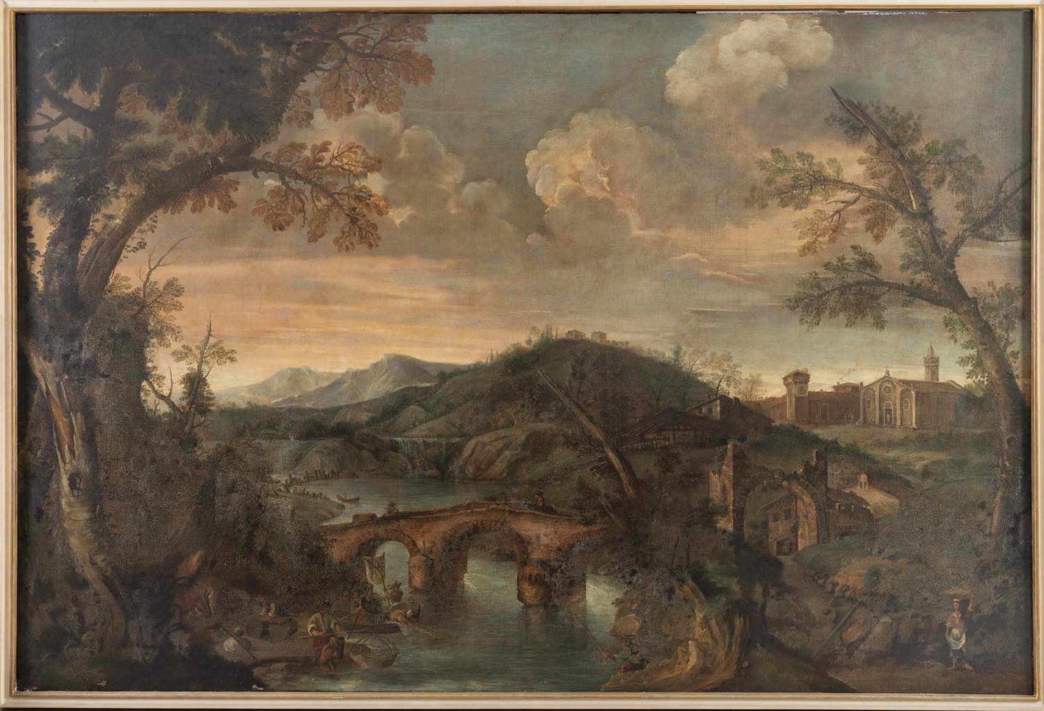 Maestro tra XVII e XVIII secolo, Paesaggio fluviale con ponte e personaggi cm 150x225 olio su tela