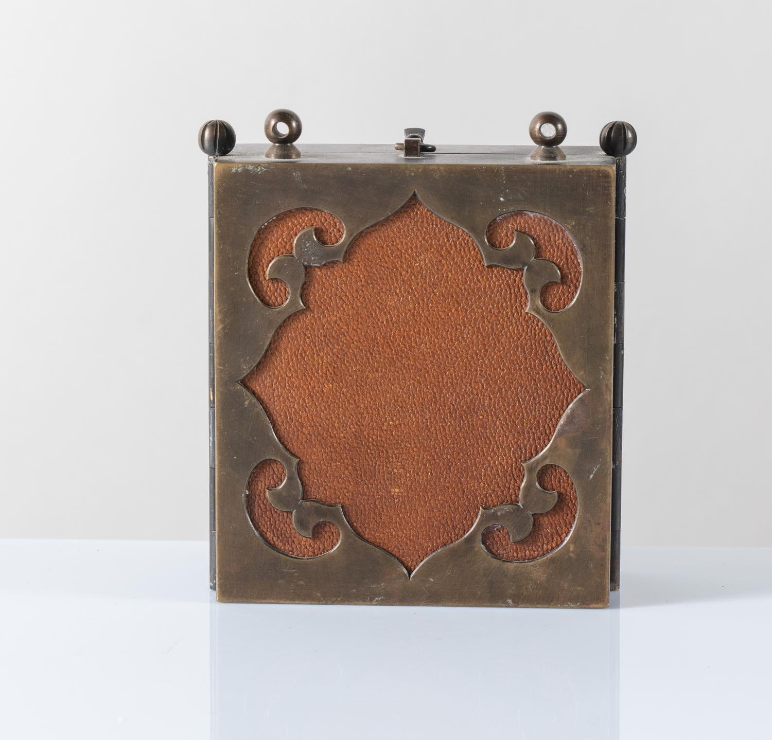 Icona richiudibile da viaggio, Arte ortodossa, inizi XIX secolo cm 10,5x9,3x4,4, apertura complessiva lunghezza cm 27,8 apertura in tre parti, con custodia in bronzo. All'interno raffigurazione di tre santi
