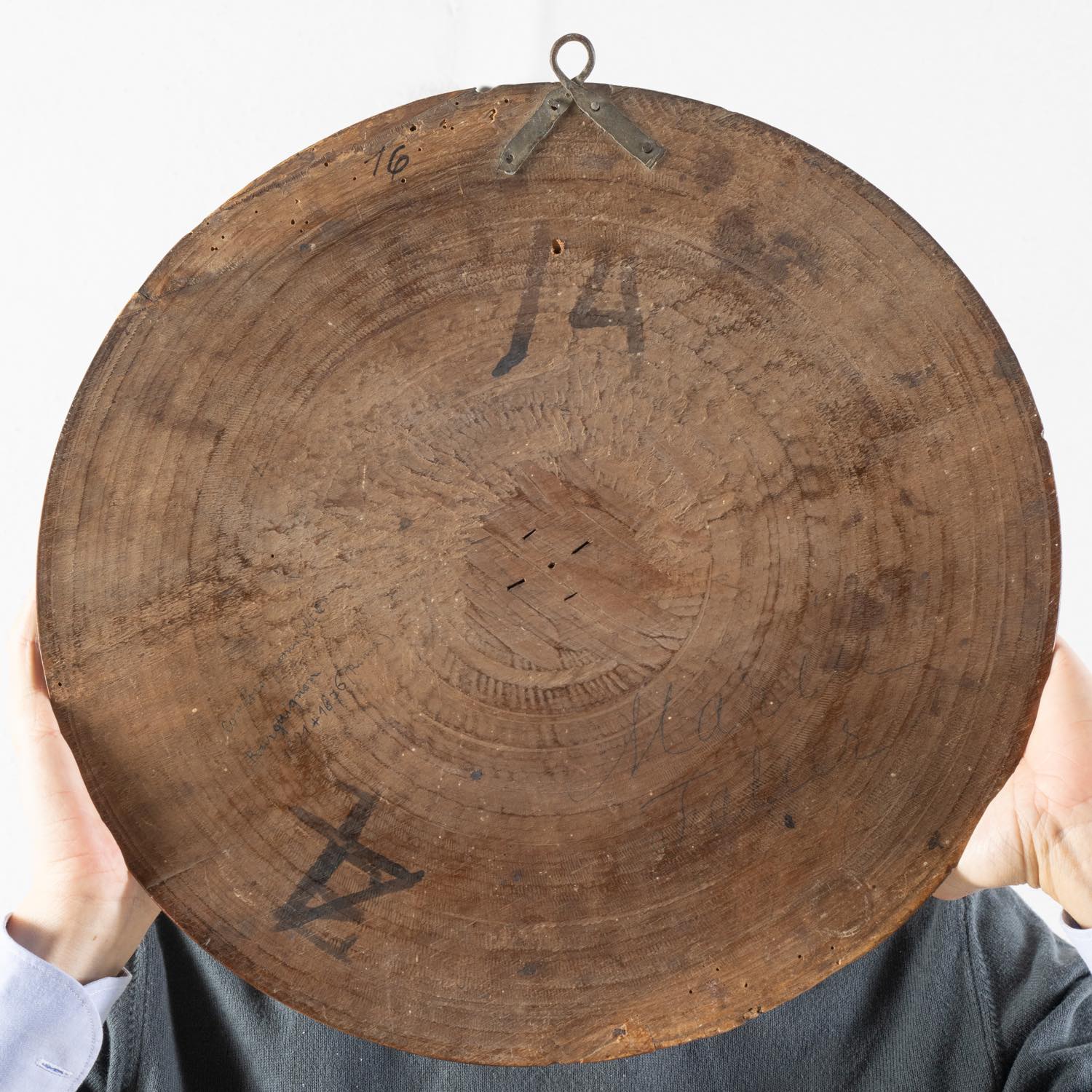 Olio su legno (rovere). Tondo lavorato al tornio in unico blocco con il supporto, diametro 39,2, altezza cm. 3. Pittura diametro cm. 22,5.