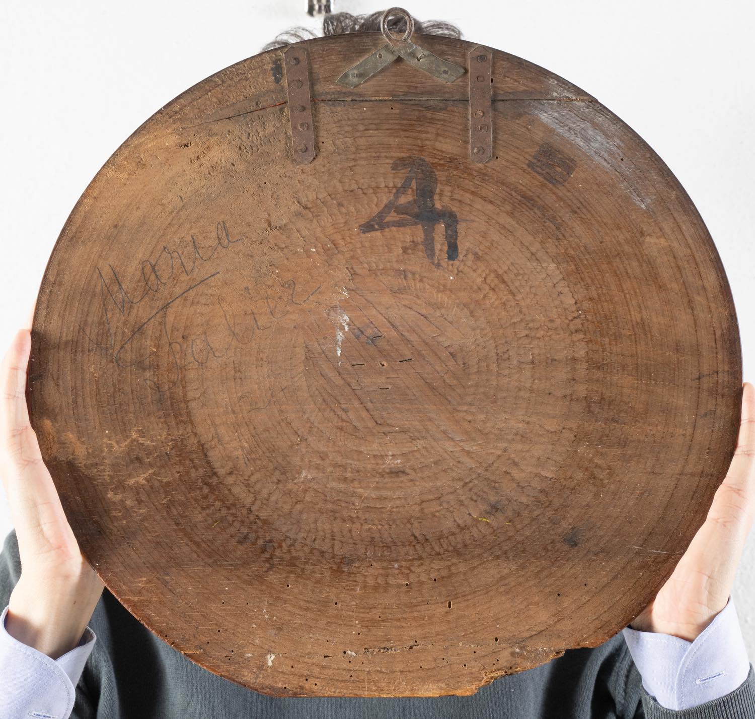Olio su legno (rovere). Tondo lavorato al tornio in unico blocco con il supporto, diametro 39,2, altezza cm. 3. Pittura diametro cm. 22,5.