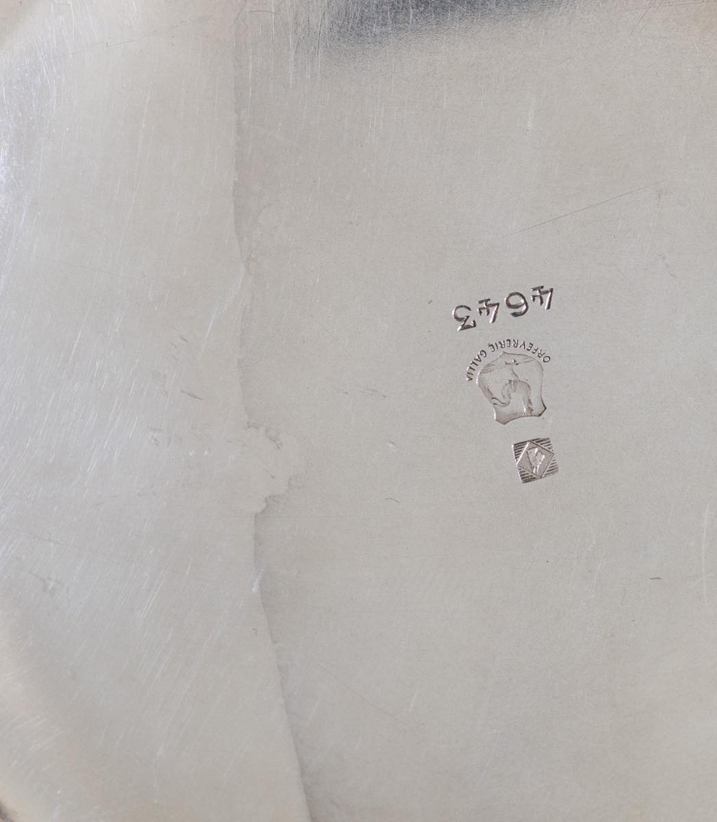 Servizio da tè e caffè in metallo argentato e vassoio, Orfèvrerie Gallia, Francia caffettiera cm 21x17, teiera cm 12,5x20,5, zuccheriera cm 10x14, vassoio cm 28x5x49,5. Sotto la base recano punzoni Orfèvrerie Gallia 4643 4643 8. Il vassoio reca punzone Orfèvrerie Gallia 4591