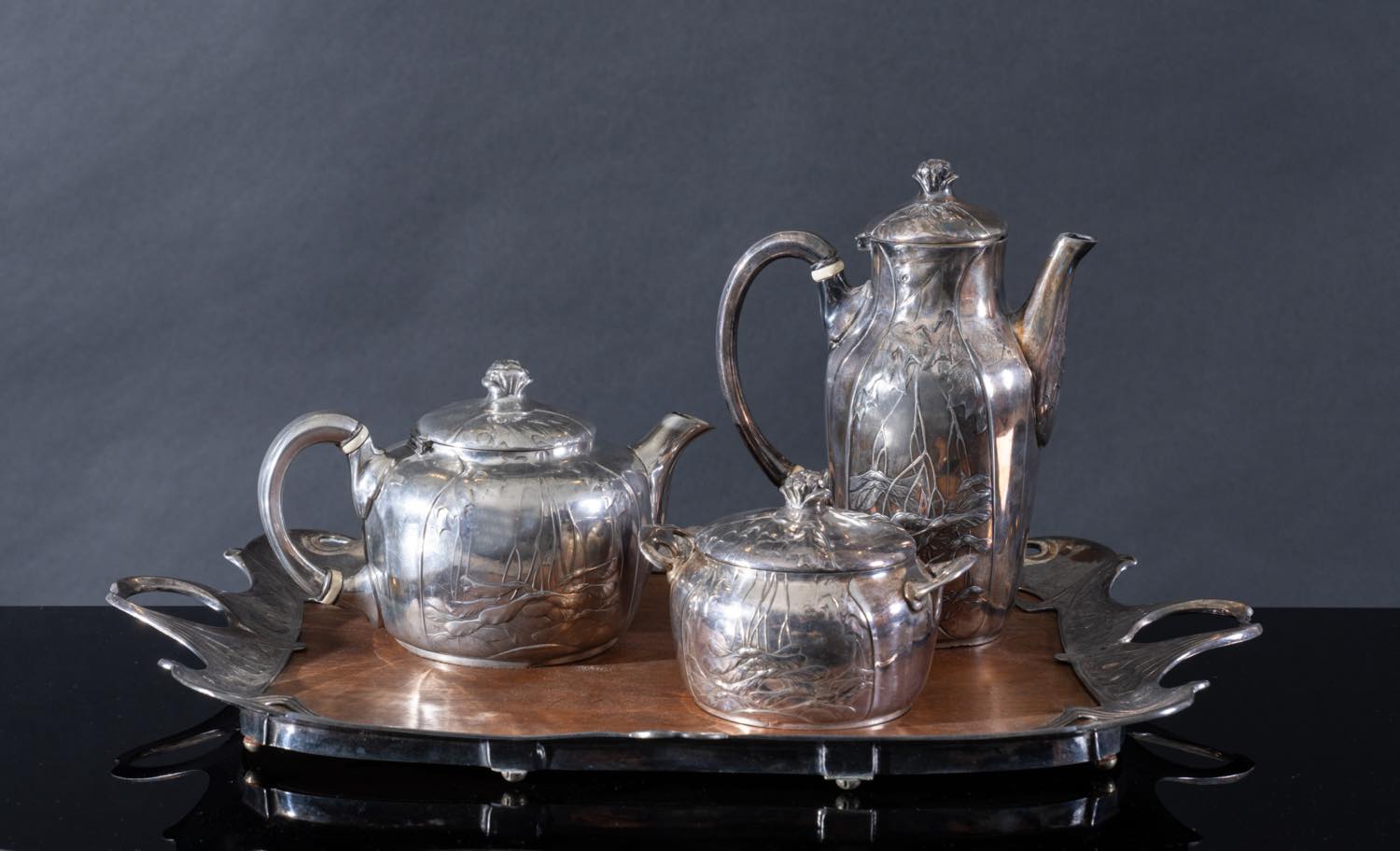 Servizio da tè e caffè in metallo argentato e vassoio, Orfèvrerie Gallia, Francia
