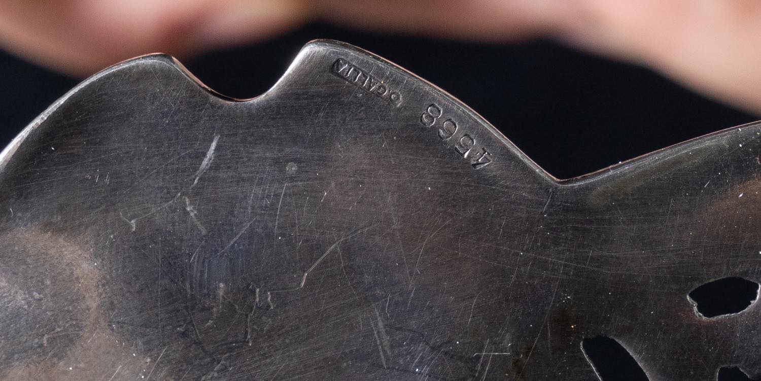 Centrotavola in metallo argentato, Orfèvrerie Gallia, 1900 cm 23x30 lavorazione traforata. Sotto la base reca punzoni O.Gallia, 4568