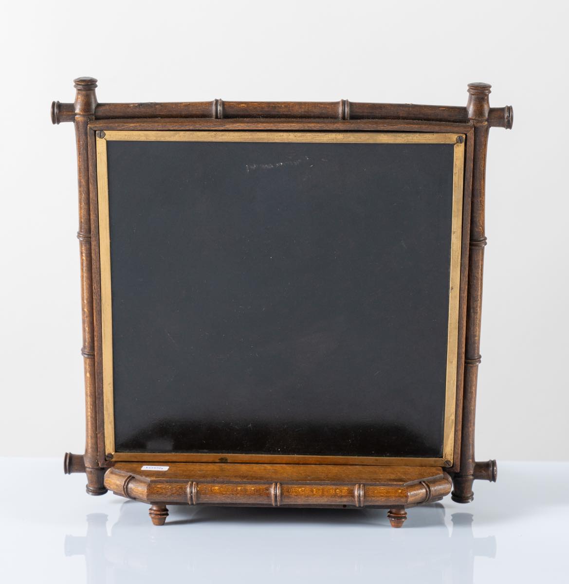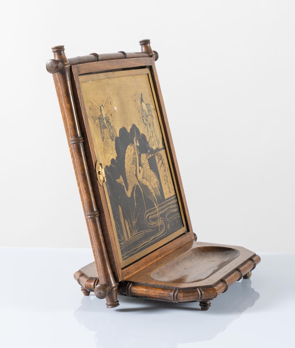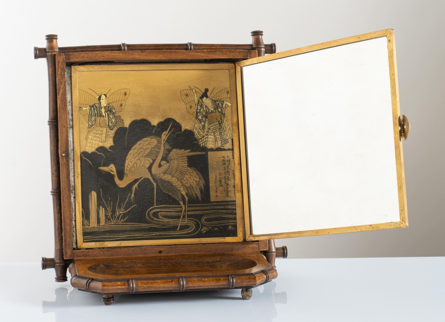 Specchio da viaggio, fine XIX secolo cm 27x27x16 richiudibile, a tre pannelli interni, appoggio in finto bambù, sull'anta richiudibile, decorazione ispirata al movimento "Japonisme", difetti. Reca inciso in alto Patent n.182635, 26 sept. 1876. Sulla sicurezza reca inciso BREVETE SGDG, PATENTED 4876