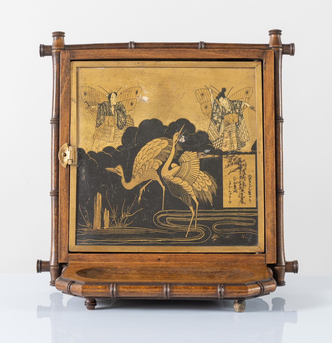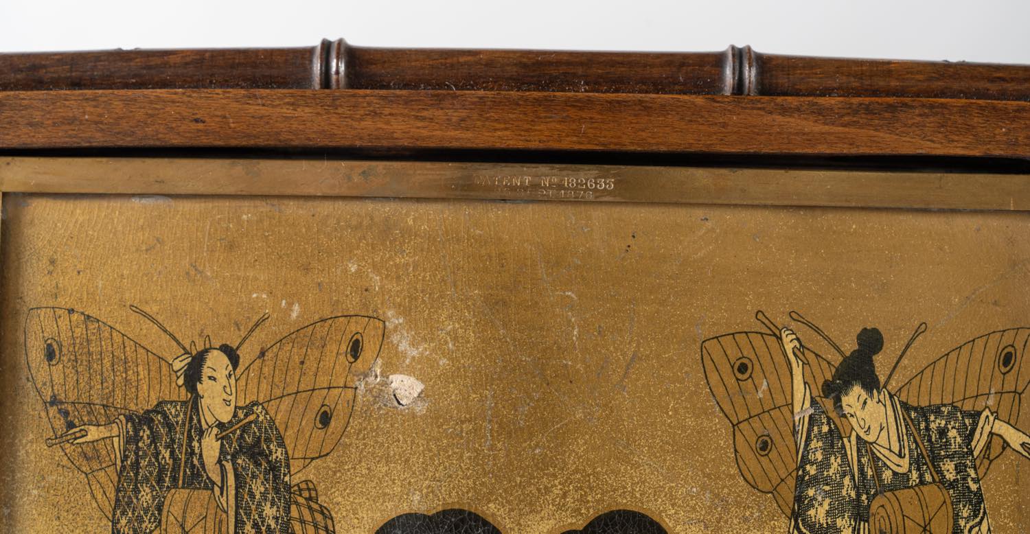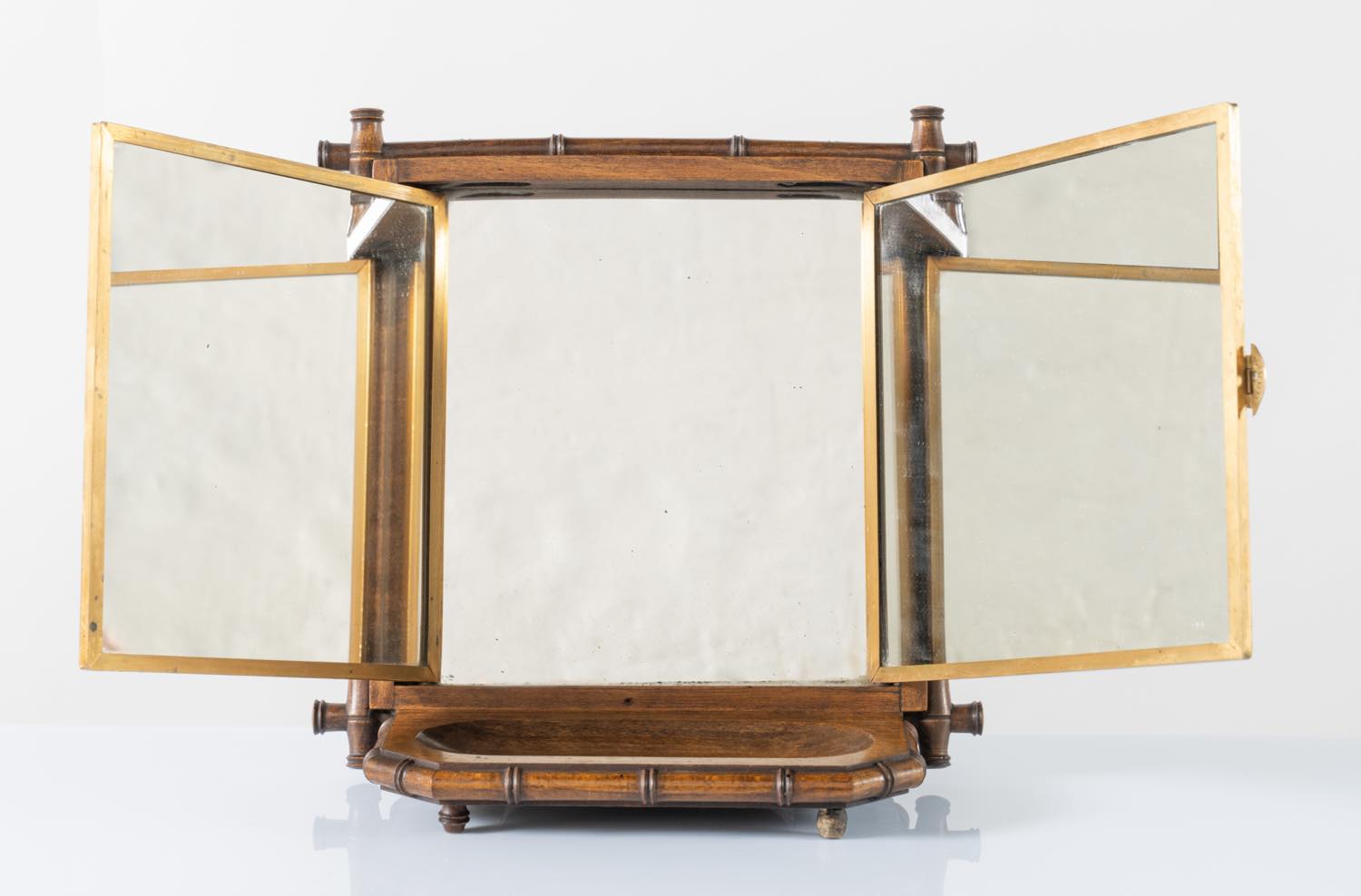 Specchio da viaggio, fine XIX secolo cm 27x27x16 richiudibile, a tre pannelli interni, appoggio in finto bambù, sull'anta richiudibile, decorazione ispirata al movimento "Japonisme", difetti. Reca inciso in alto Patent n.182635, 26 sept. 1876. Sulla sicurezza reca inciso BREVETE SGDG, PATENTED 4876