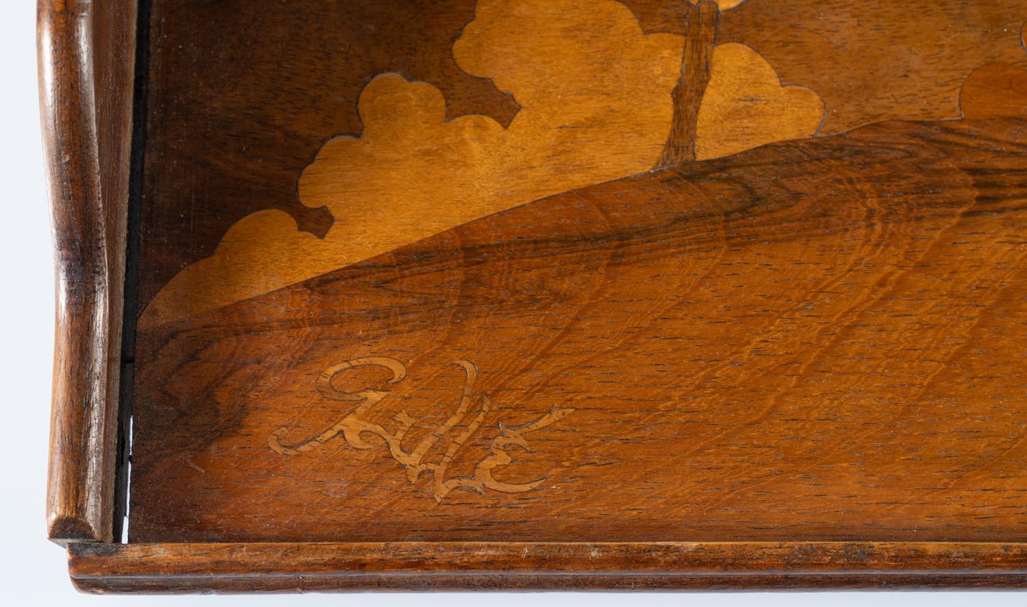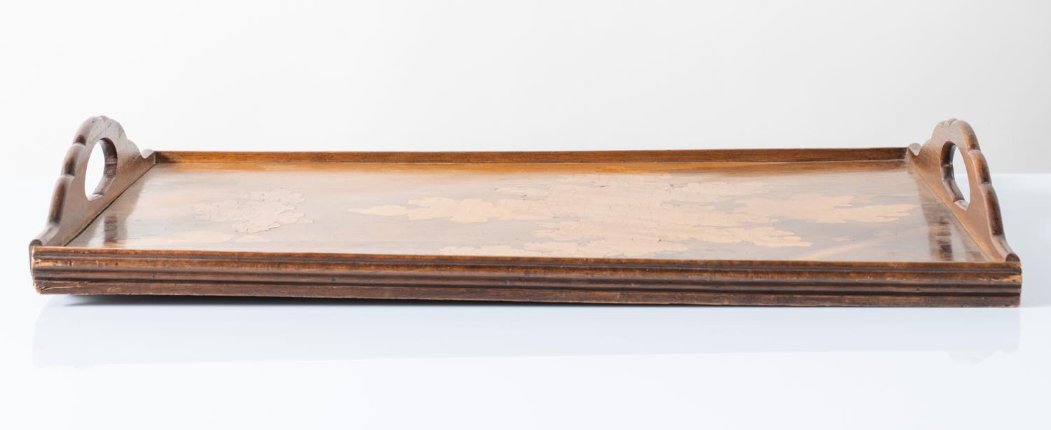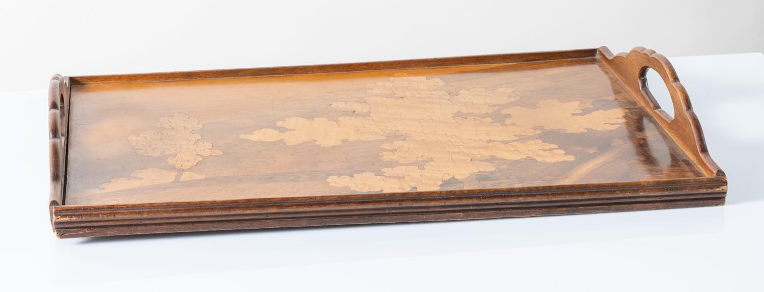 Émile Gallè (1846-1904), Francia Vassoio rettangolare in legno, cm 9x60x38 a due impugnature con intarsi in legno di frutto che disegnano un paesaggio con alberi e colline, firmato Gallè