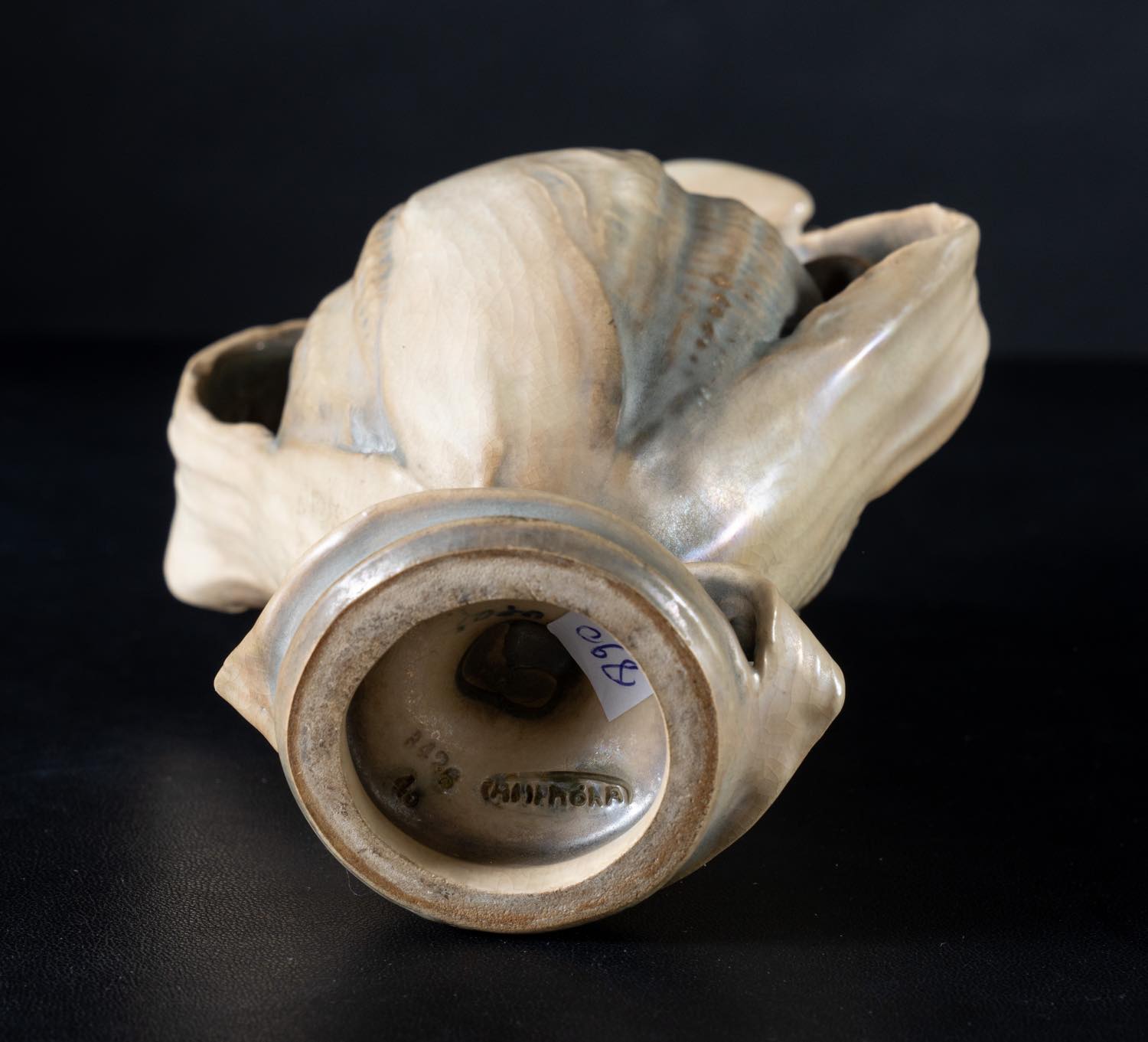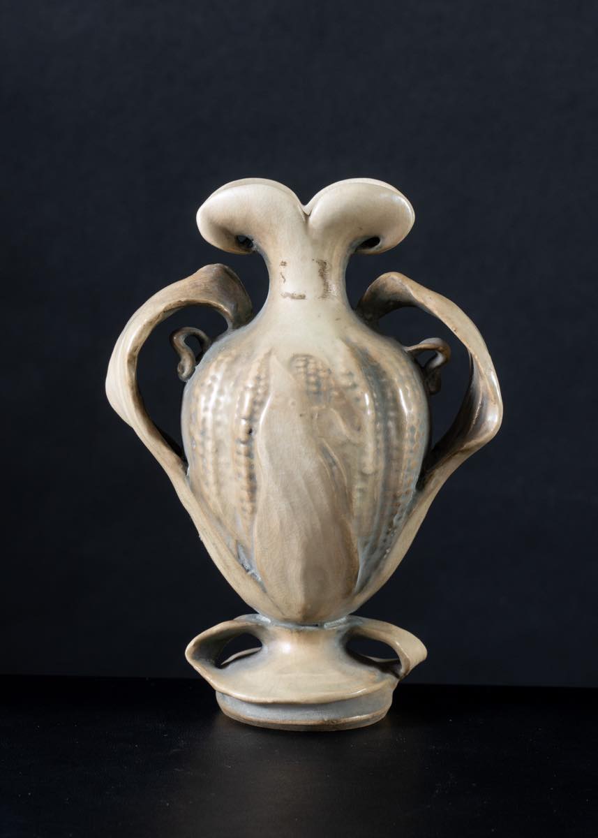 Vaso in porcellana a forma di piccola anfora, AMPHORA, circa 1900 cm 17x13 in guisa di pannocchia, con foglie avvolgenti dalla base intorno al corpo del vaso. Sotto la base reca marchio impresso AMPHORA in un'ovale e cifre impresse