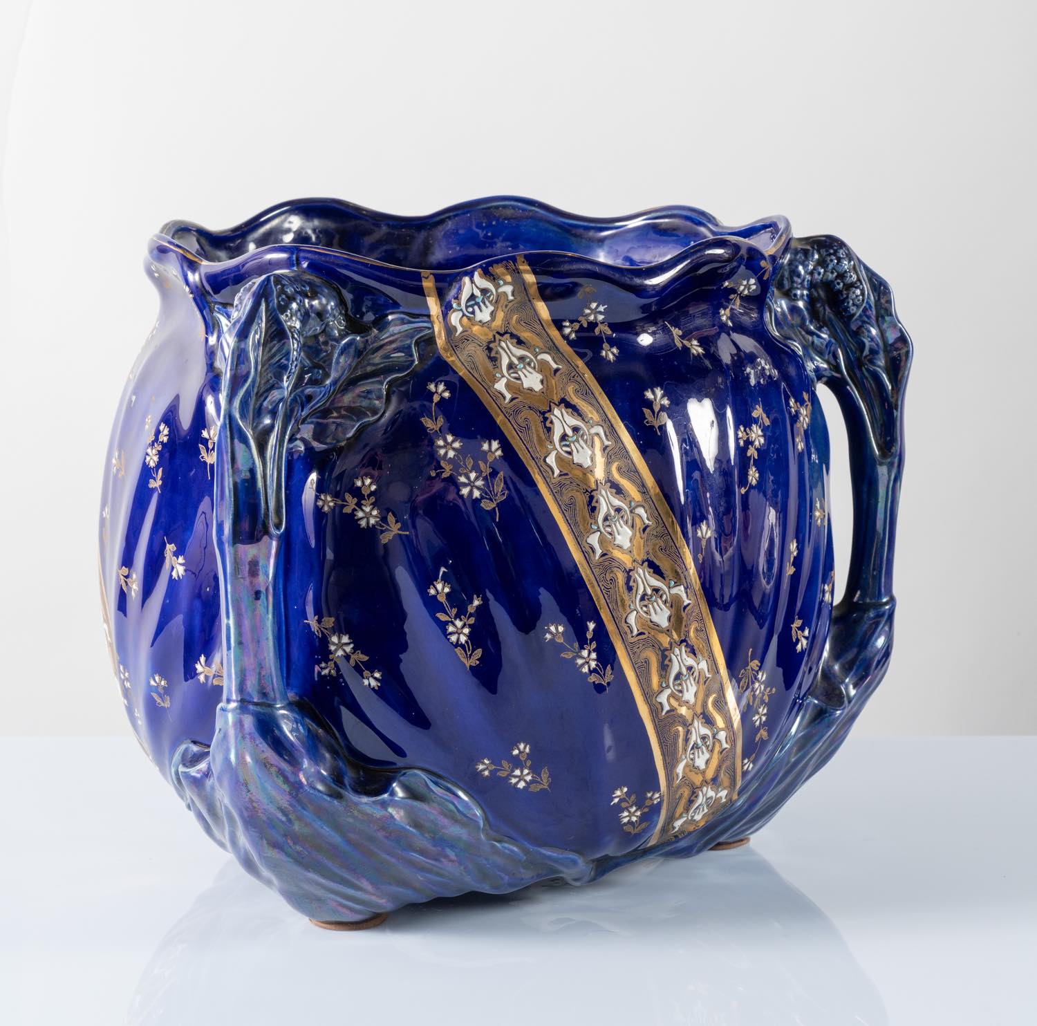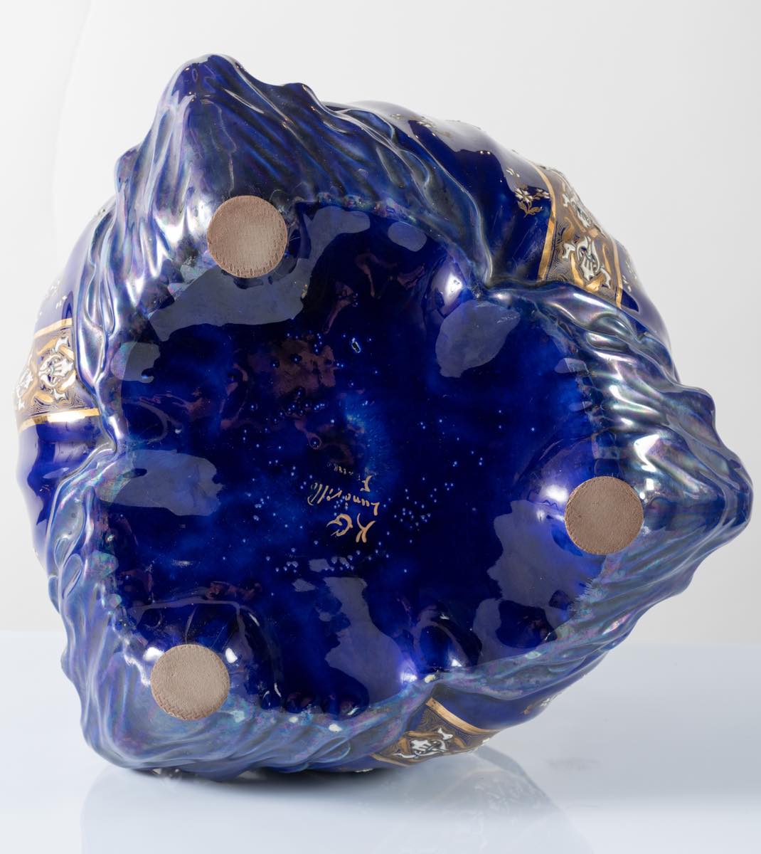 Cachepot a tre anse in maiolica blu, LUNEVILLE, Francia cm 34, diam complessivo 42 decori floreali a smalti bianchi e stilizzati in una fascia color oro. Firma sotto la base KG Lunéville France