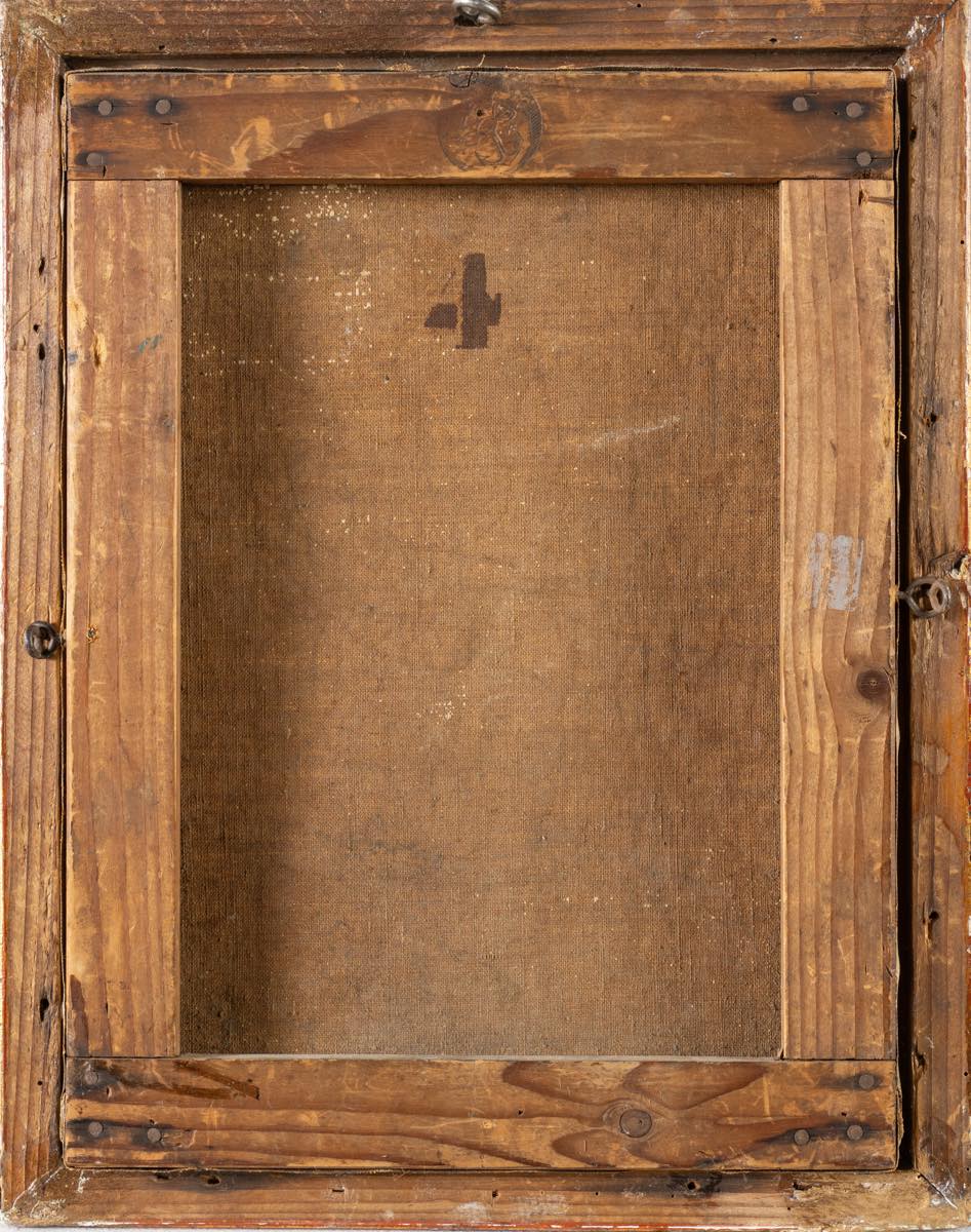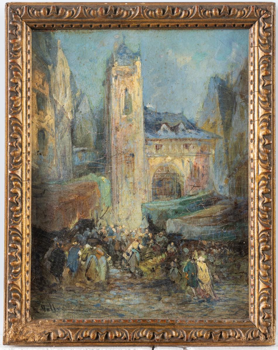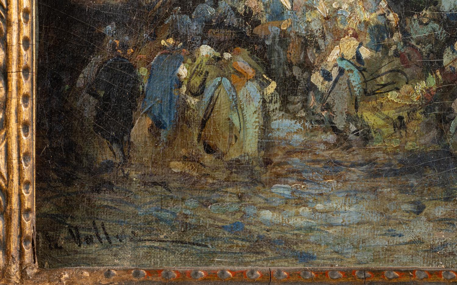 Scena di mercato, XX secolo cm 32,5x25 olio su tela. Opera firmata in basso a sinistra