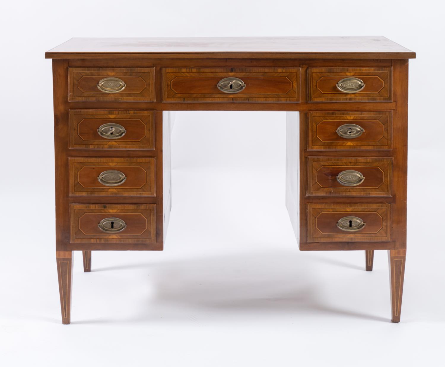 Scrittoio bolognese, area emiliana, probabilmente Bologna, fine XVIII inizio XIX secolo cm 83,5x108,7x62 lastronato in noce con motivi di filetto d'acero, legno ebanizzato, con riserve in ciliegio
