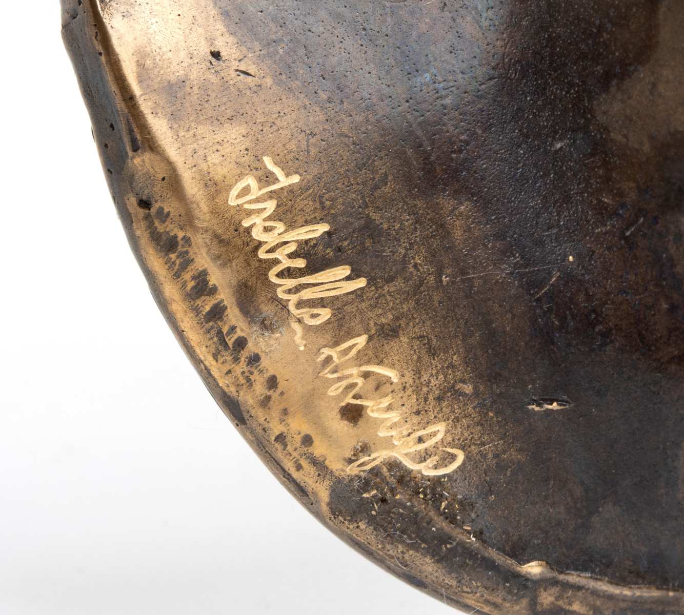 montatura in bronzo con incastonati due fossili di ammonoidea. Firmato ISABELLA ASTENGO.