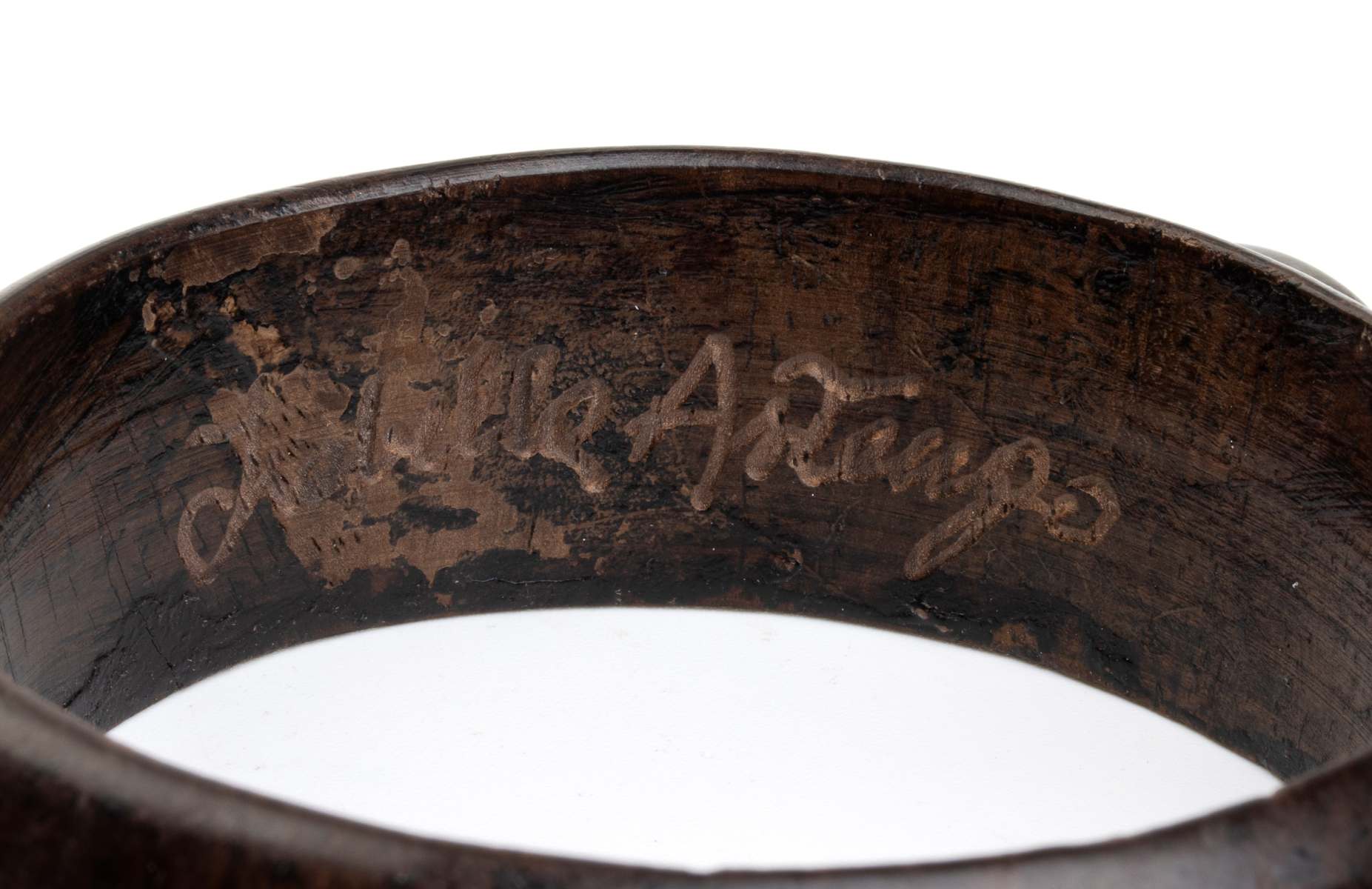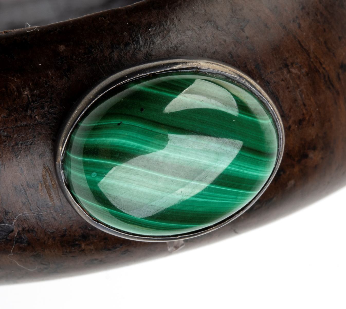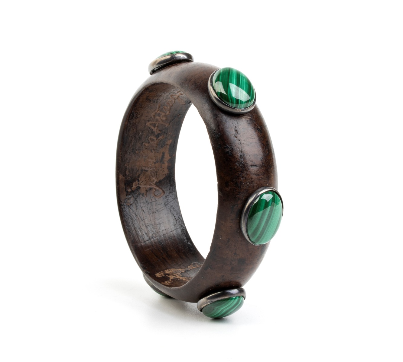 bracciale in legno con 6 cabochon di malachite. Firmato ISABELLA ASTENGO.
