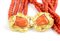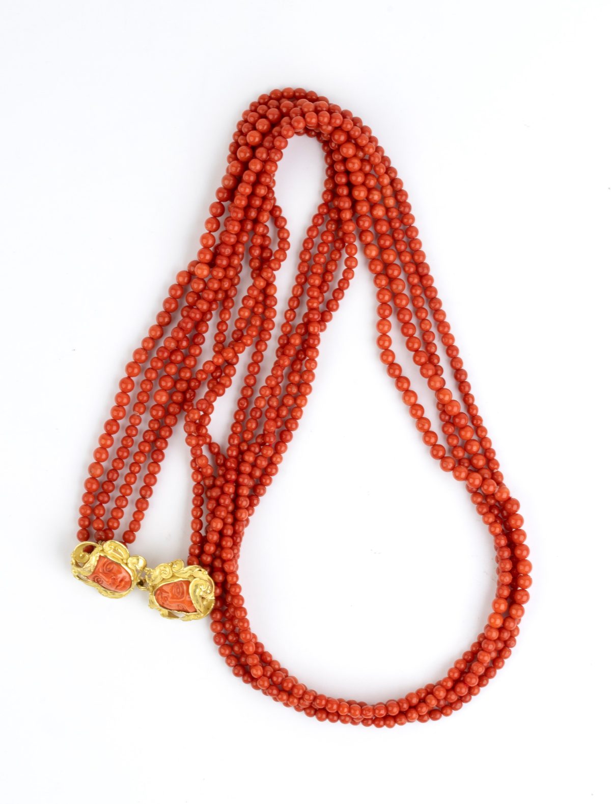 ad un filo di sfere di corallo Mediterraneo (corallium rubrum), fermezza in oro giallo incastonata con coppia di cammei in corallo, raffiguranti due volti.
