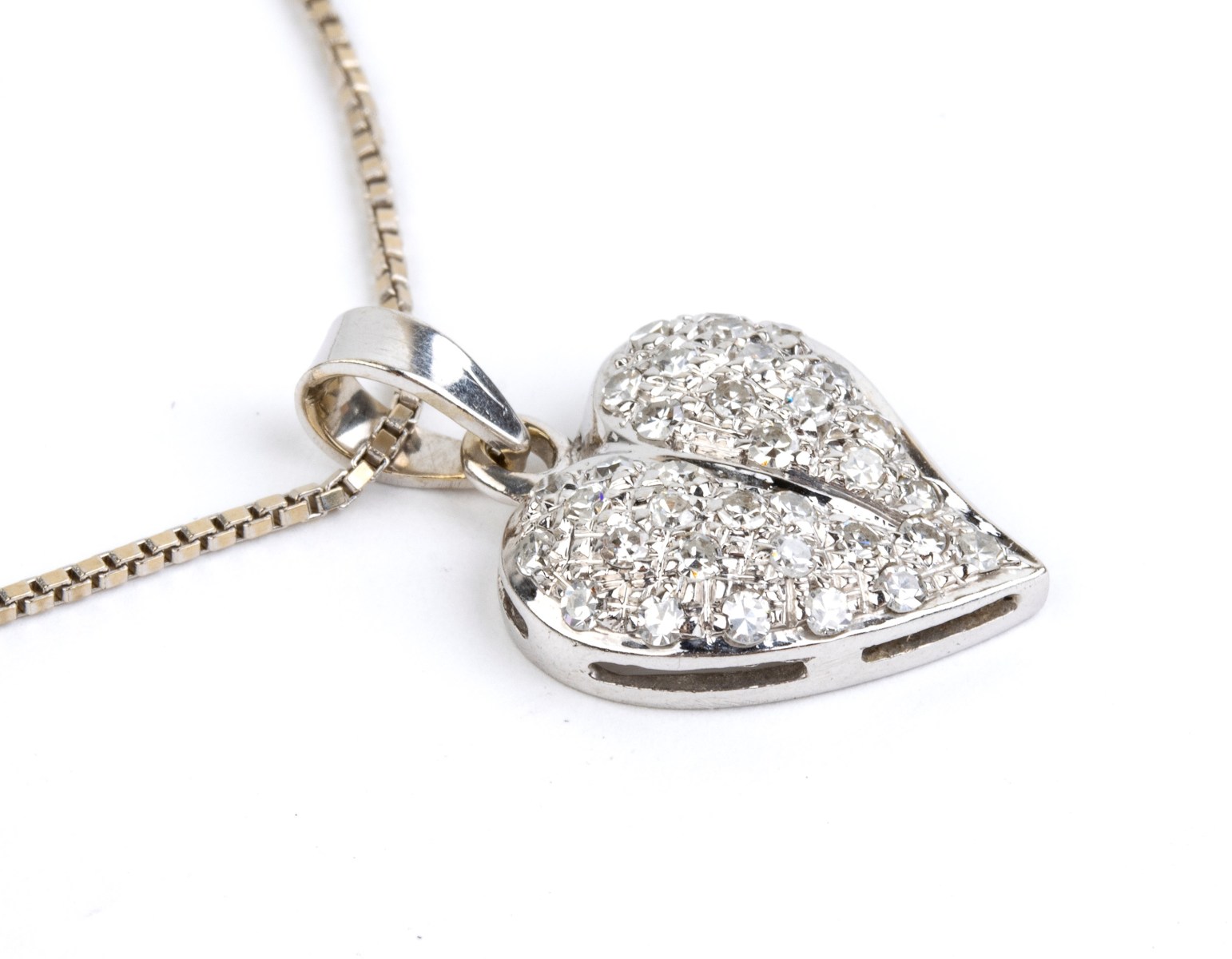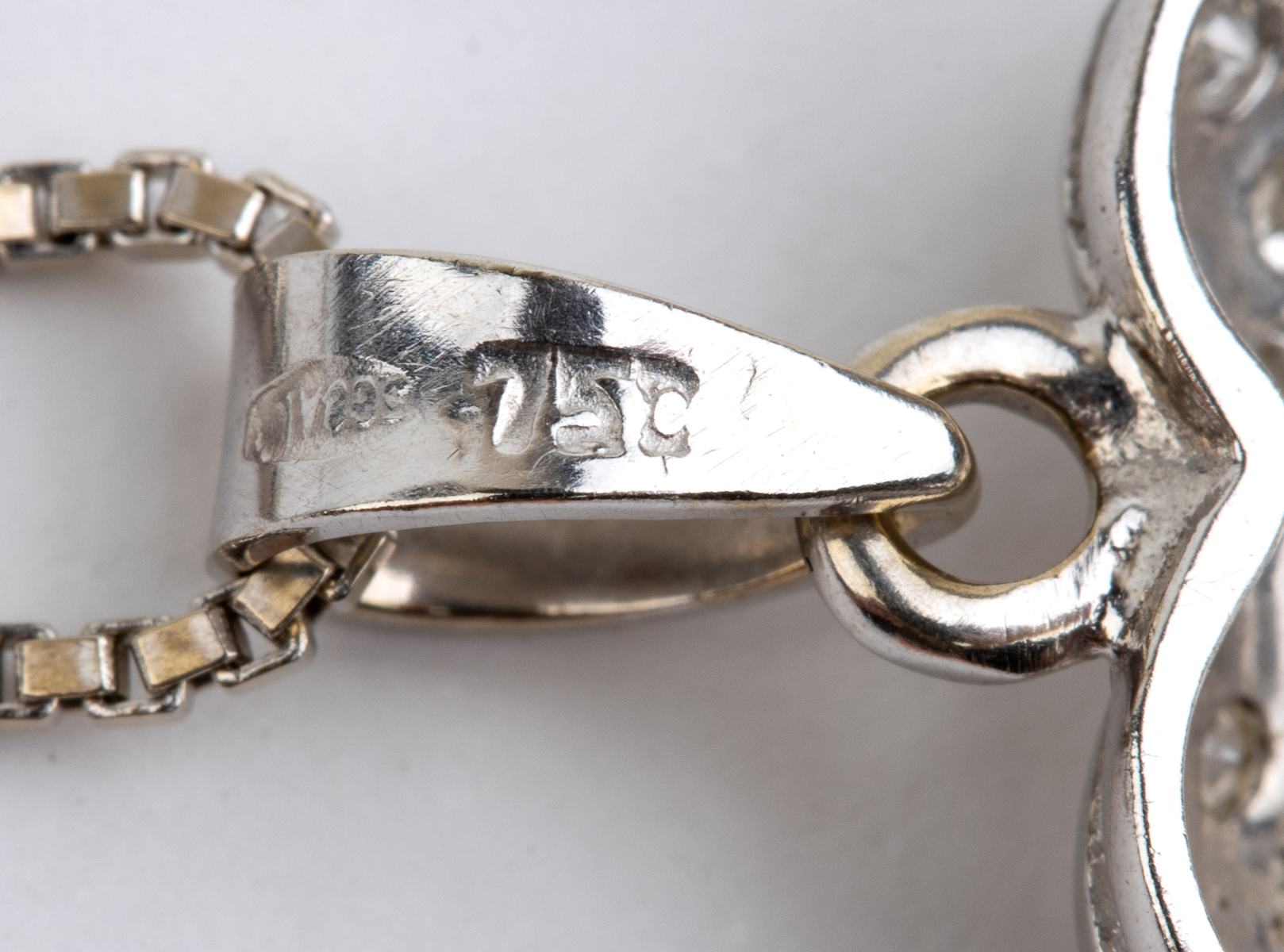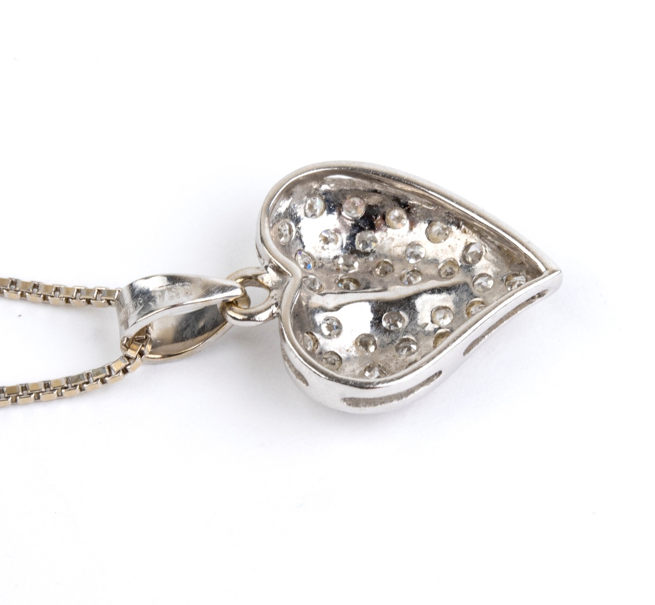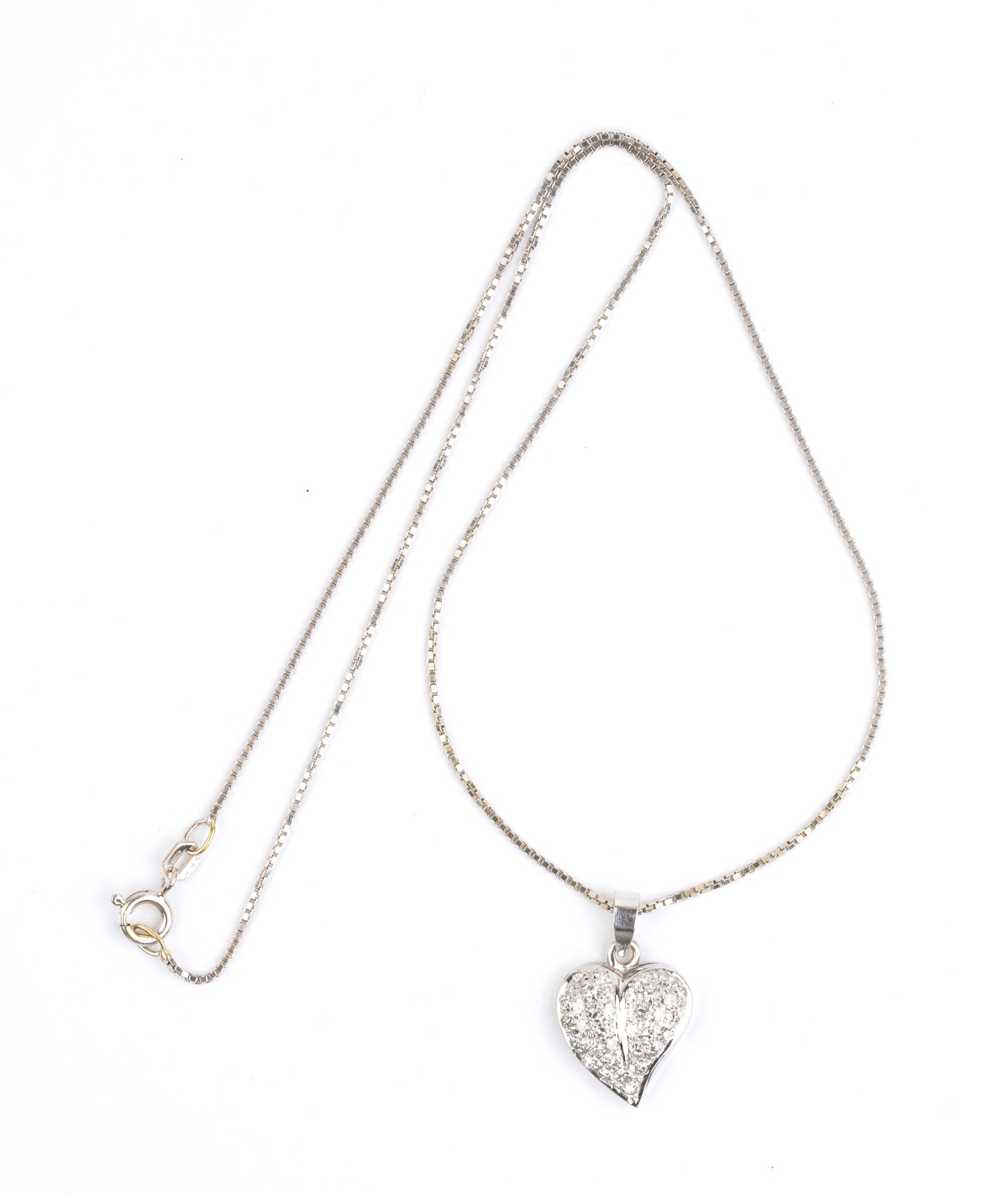 Catenina punzonata "750 - 604 AR"; cuore punzonato "750 - 588 AL". Dimensioni pendente 2,5 x 1,4 cm. Lunghezza catena 42,5 cm. Peso complessivo 5,3 gr.