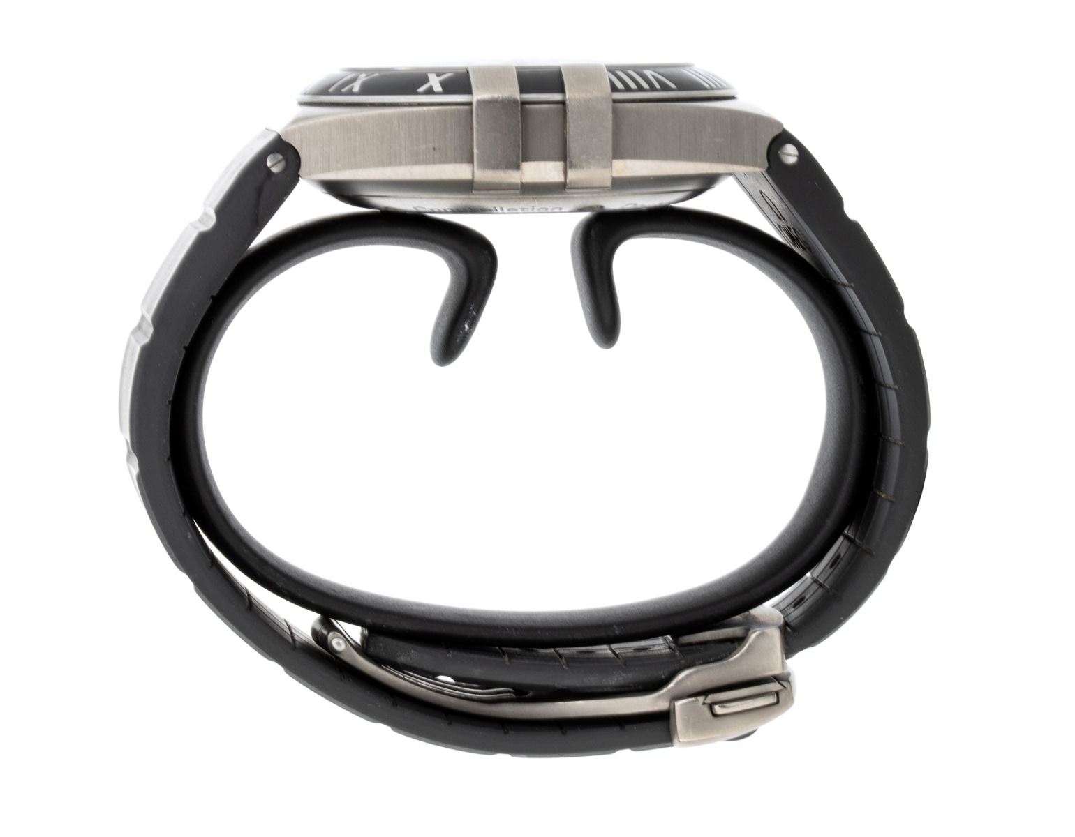 cassa in metallo con fibbia deployante in acciaio e cinturino in gomma, quadrante nero con 3 contatori e datario alle ore 4 1/2. Movimento automatico. Ref. 78343678.