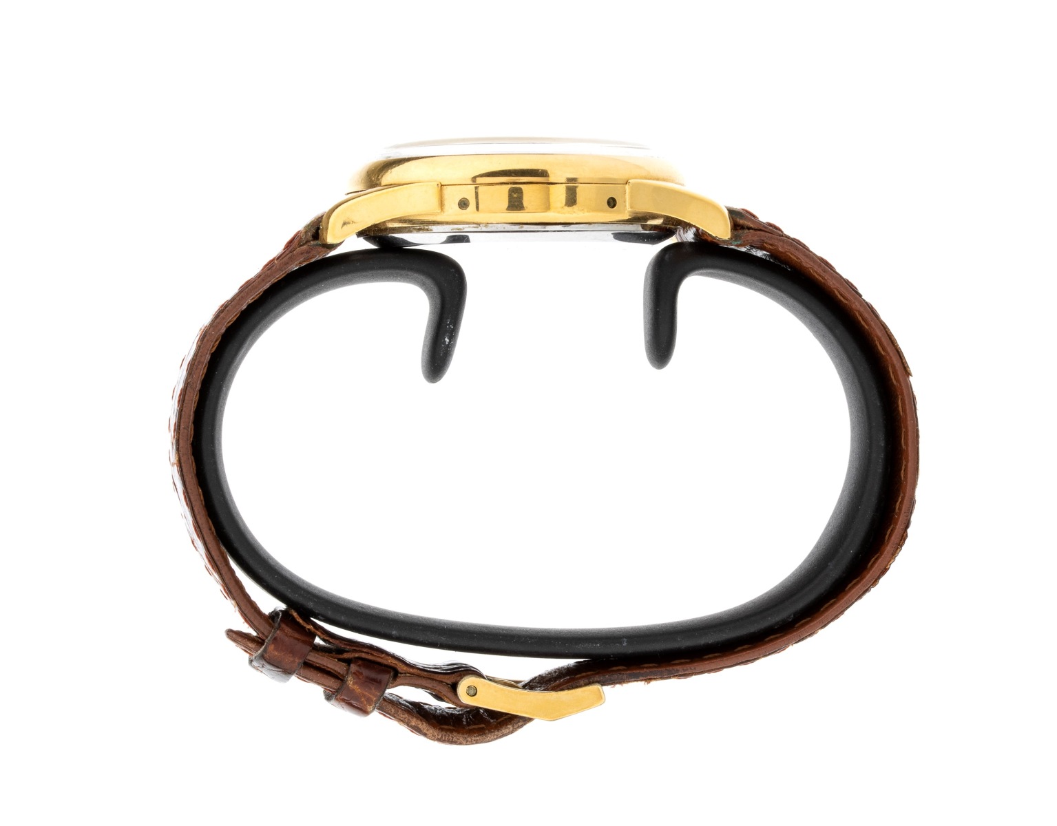 cassa placcata in oro e fondello in acciaio a scatto, cinturino in pelle, quadrante argentè con numeri arabi dorati e altre parti policrome. Presenti giorno e mese a ore 12 e data sul perimetro, fasi lunari ore 6. Movimento meccanico a carica manuale. Base venus 206.