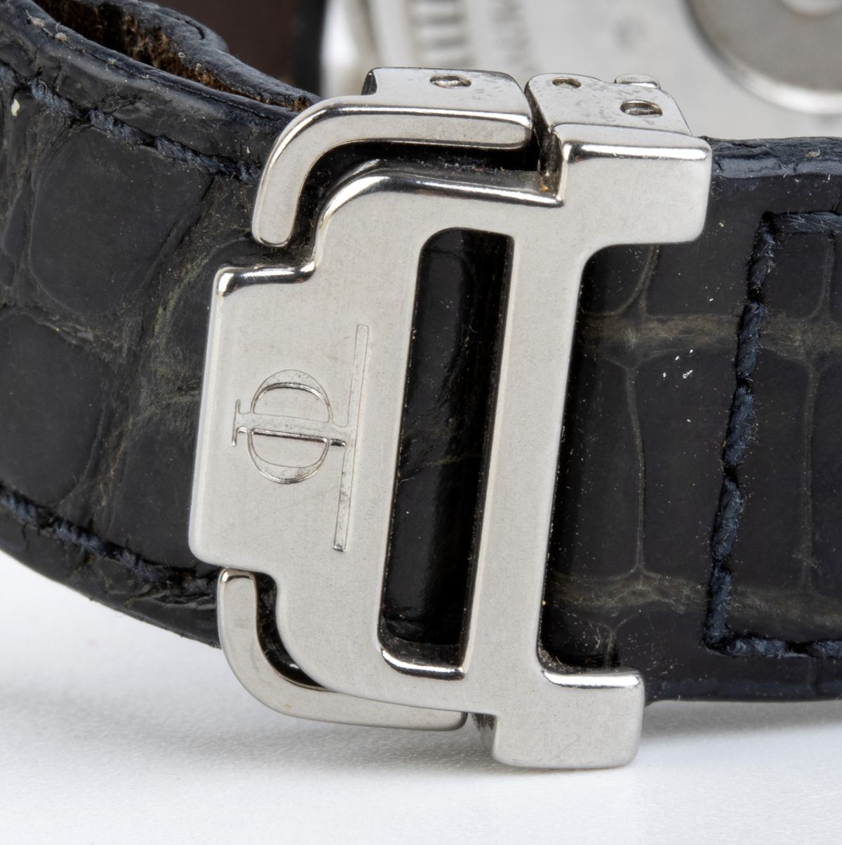 cassa in acciaio e cinturino in pelle con fibbia deployante in acciaio. Quadrante argenté con 3 contatori e datario ore 3. Carica automatica. Referenza MV045208, matricola 2960729,  calibro ETA7750.