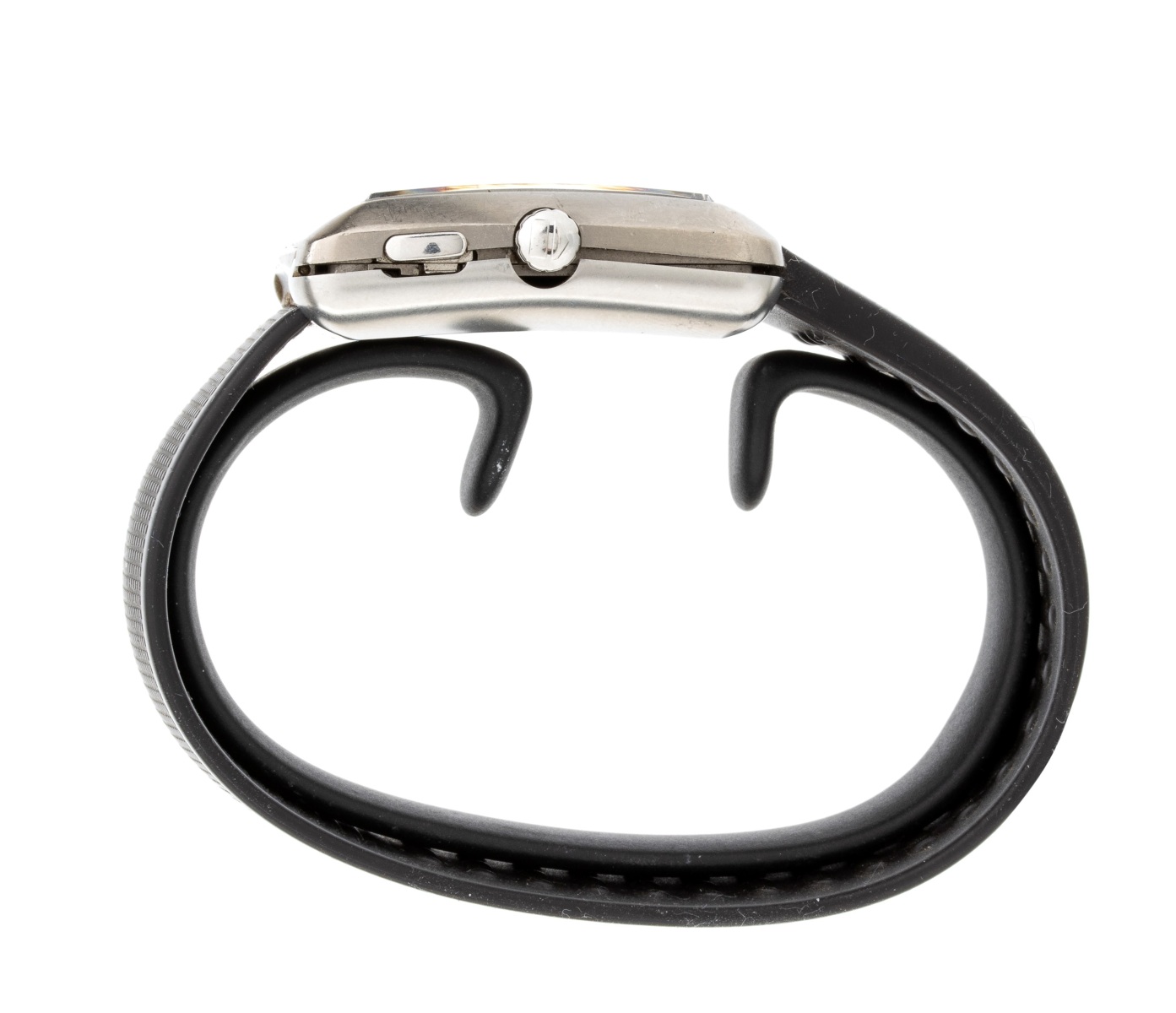 cassa in acciaio di forma quadrata con fibbia deployante incorporata, cinturino in gomma. Quadrante nero con indici a sfere argentate e datario ore 3. Movimento al quarzo.
