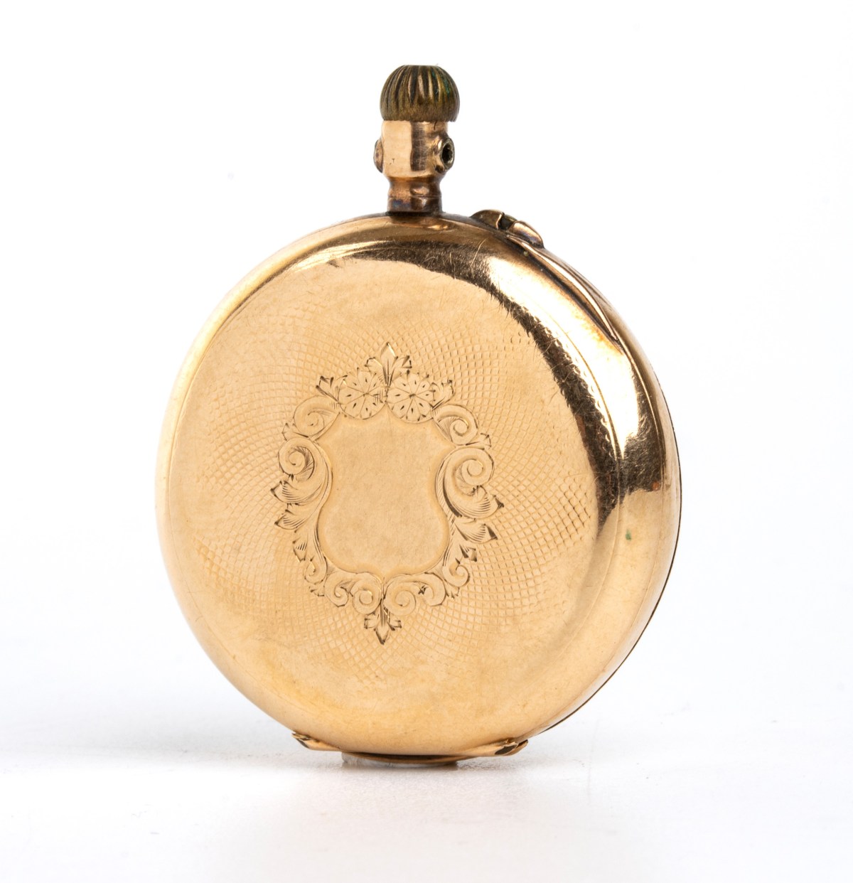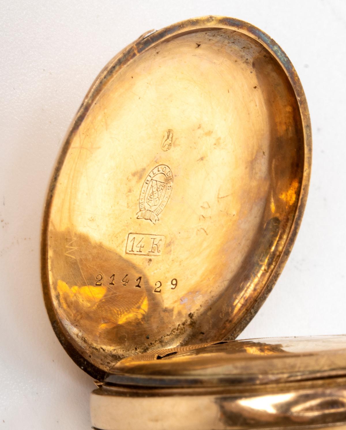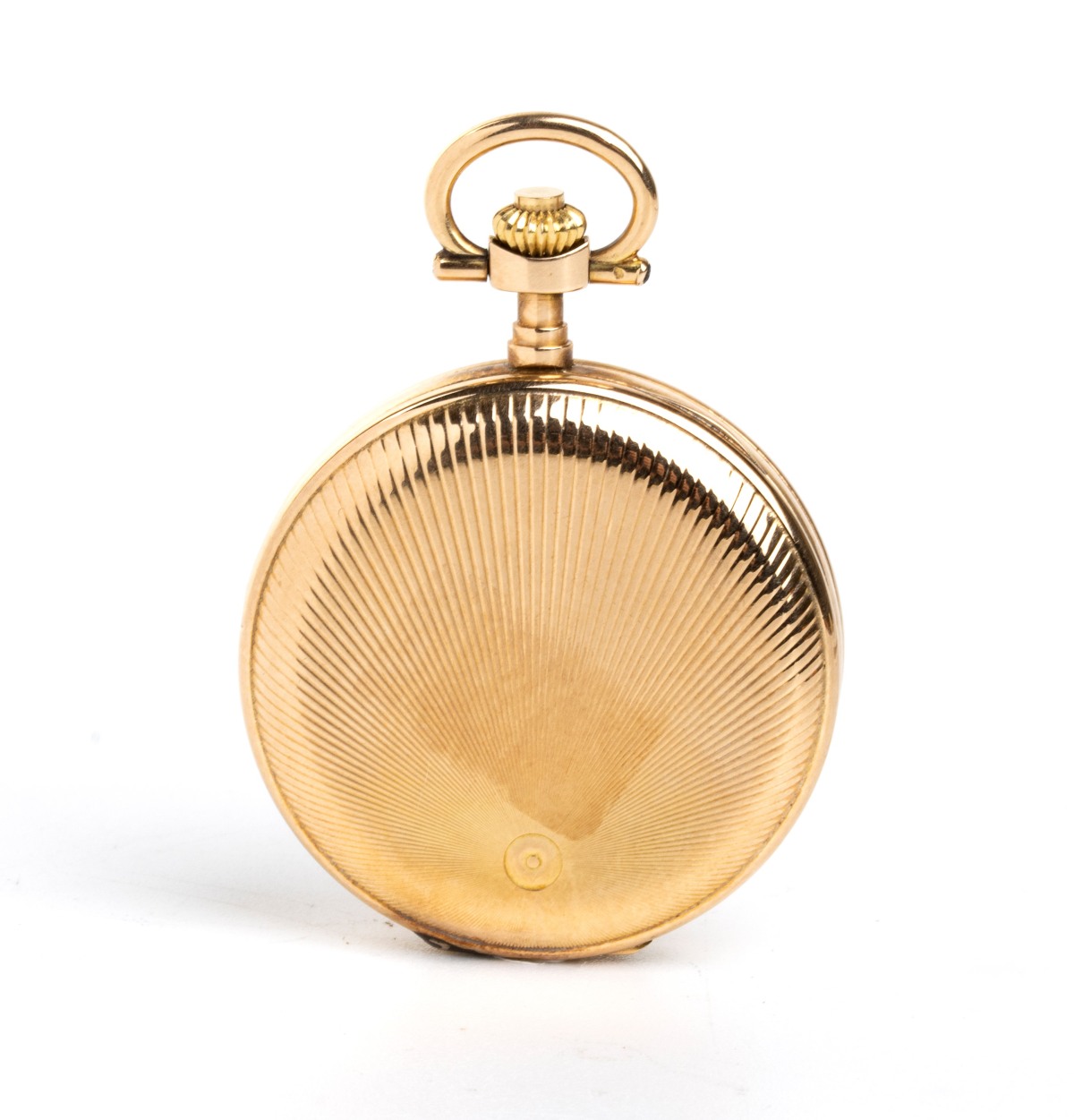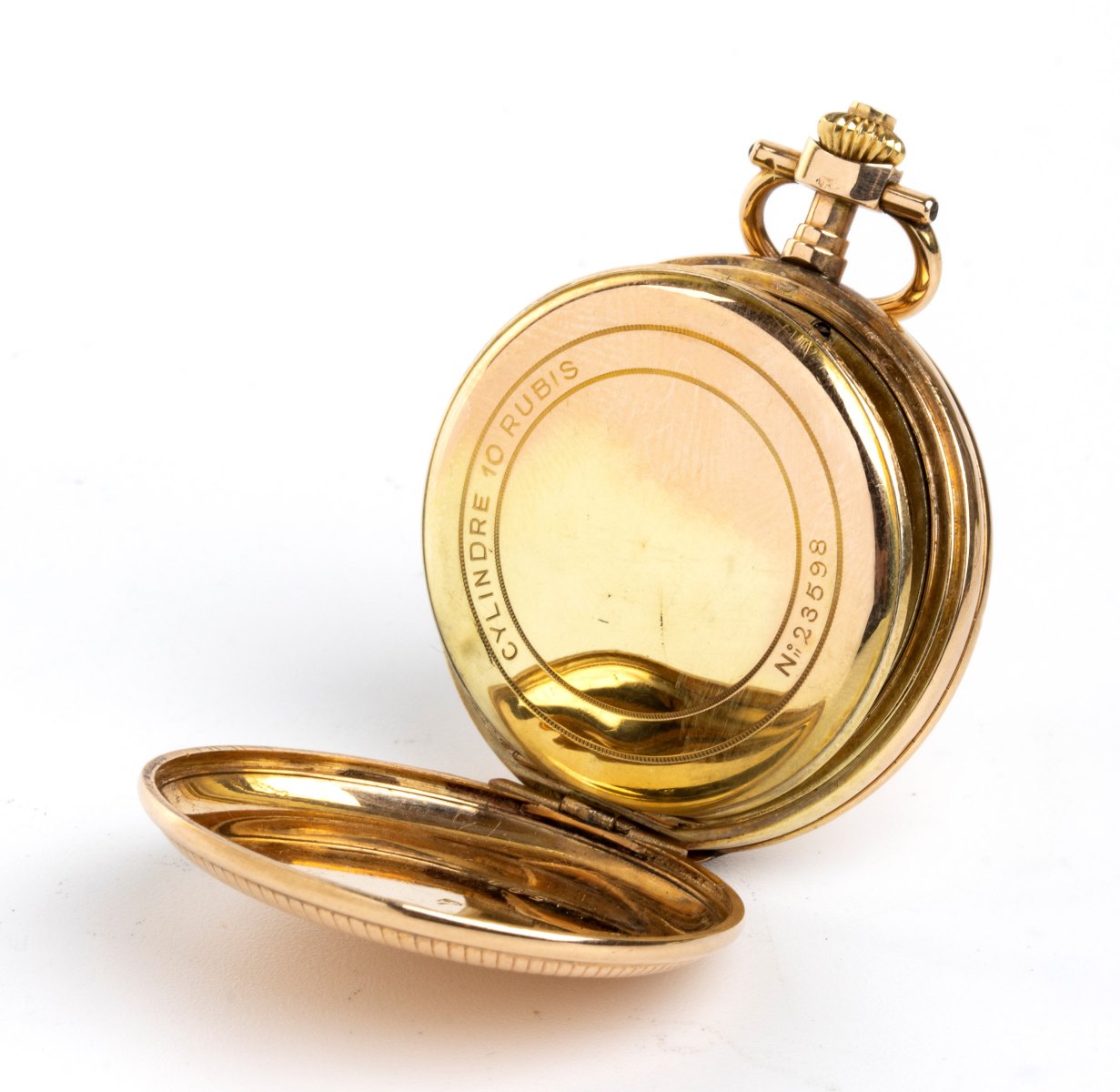 1) Un orologio da tasca con tripla cassa in oro basso 14k, quadrante ceramica con indici romani e secondi alle 6. Movimento a cilindro. Ref. 23598. Diametro cassa 32 mm. Attualmente marciante.