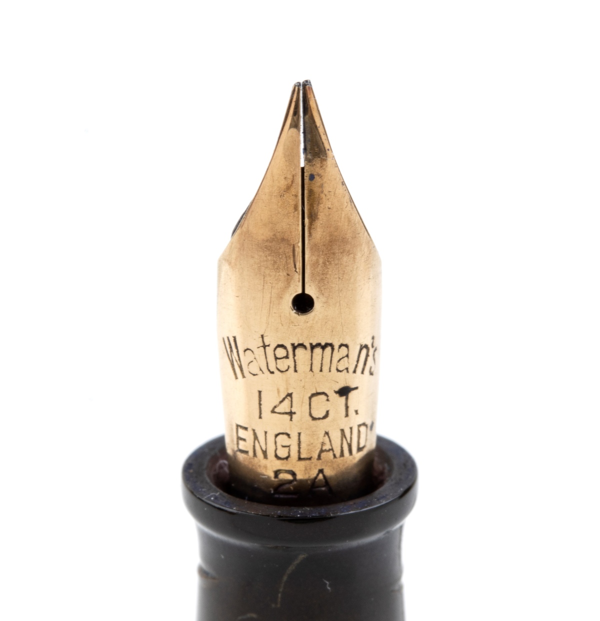 corpo in lacca nera con finiture dorate, pennino in oro 14k riportante la dicitura "14K - Waterman - England - 2A". Sistema di caricamento a stantuffo.