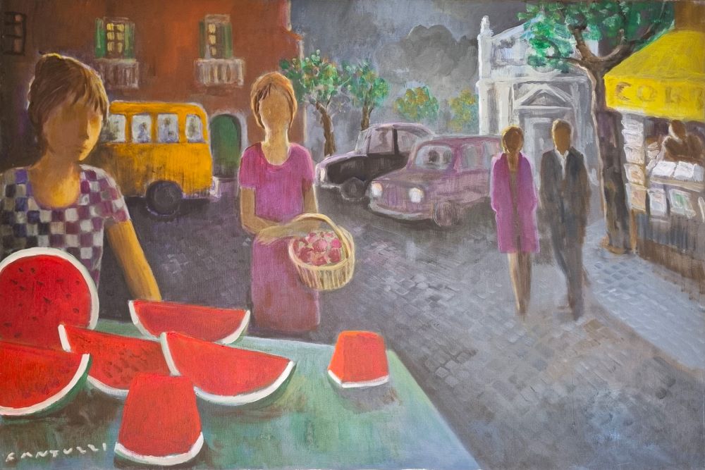 FANTUZZI ELIANO Modena 1909 - Verona 1987 "Senza titolo" Olio su tela cm 120x80. Firmato sul fronte in basso a sinistra e sul retro. Autentica ed archivio su foto a cura dell'Archivio Generale.