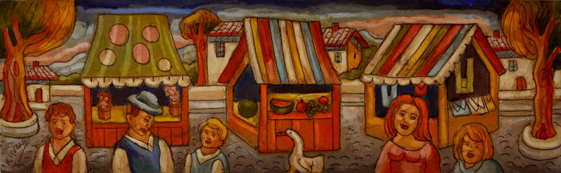 ROBERTO SGUANCI Mercatino Olio su cartone cm. 12x40 Firma in basso Firma e titolo sul retro