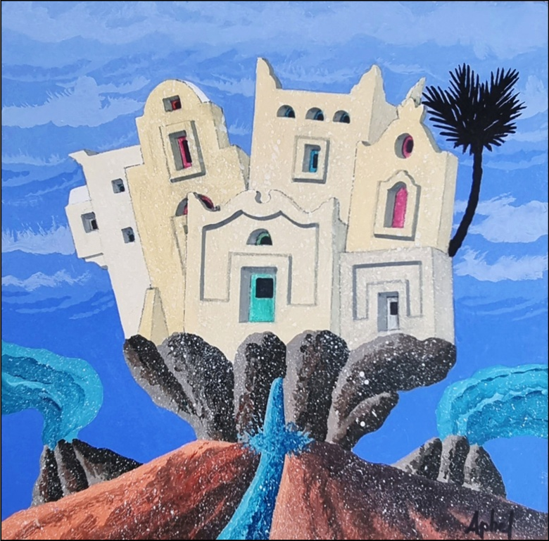 APHEL FABIO Cavalese (TN) 1957 "La meteora della fonte" Olio su tavola cm 25x25. Firmato sul fronte in basso a destra, sul retro titolo, firma e dimensioni.