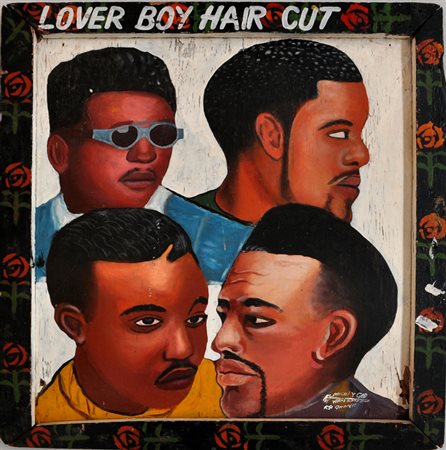 ALMIGHTY GOD Lover boy hair cut Olio su tavola in cornice dipinta cm. 70x64 Firma in basso