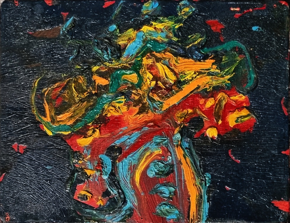 DONZELLI BRUNO Napoli 1941 "Figure della nuova borghesia" Tecnica mista su tavola cm 18x14, del 1964. Al verso firma, titolo ed anno. Autentica su foto con dedica a cura del Maestro.